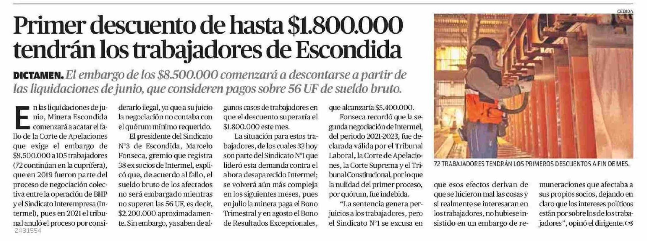 Primer descuento de hasta $1.800.000 tendrán los trabajadores de Escondida 13-06-2025 El Mercurio de Calama |