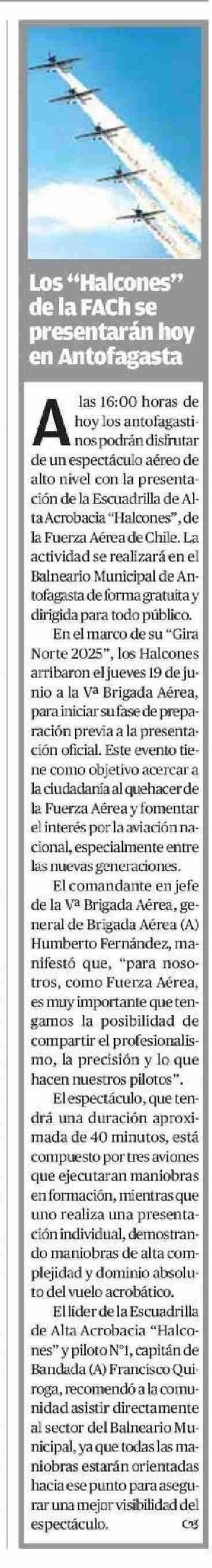 Los "Halcones" presentarán hoy en Antofagasta de la FACh se 21-06-2025 El Mercurio de Calama |
