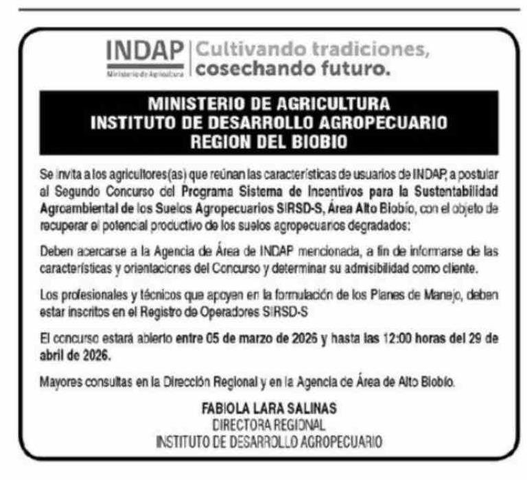 Título: Extractos: INDAP | Cultivando tradiciones, Ministeriede Agiant:wa | Cosechando futuro. MINISTERIO DE AGRICULTURA INSTITUTO DE DESARROLLO AGROPECUARIO REGION DEL BIOBIO Se invita a los agricultores (as) que reúnan las características de usuarios de INDAP, a postular al Segundo Concurso del Programa S