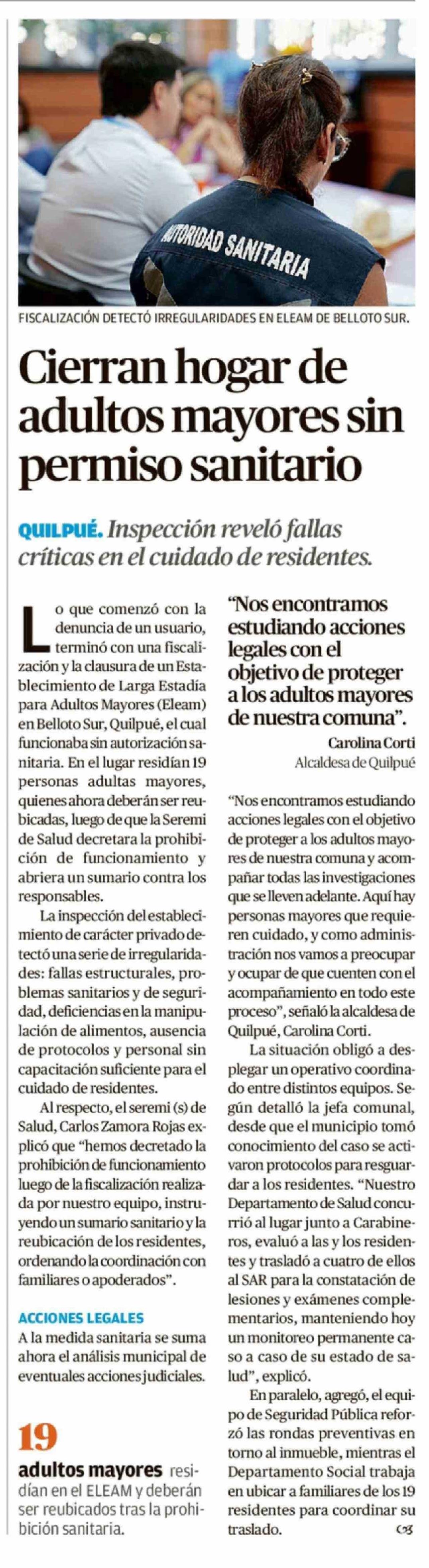 Cierran hogar de adultos mayores sin permiso sanitario 21-02-2026 El Mercurio de Valparaíso |