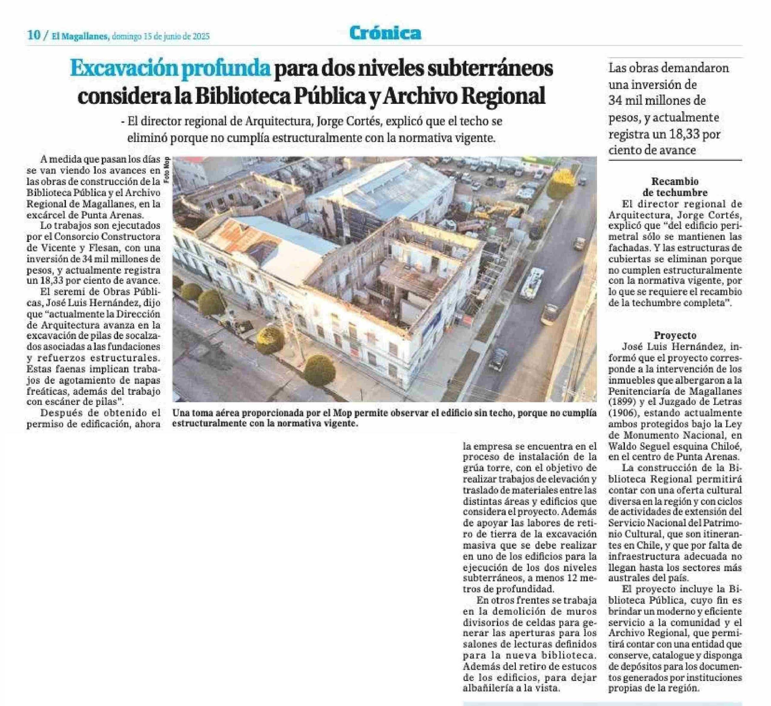 Excavación profunda para dos niveles subterráneos considera la Biblioteca Pública y Archivo Regional 15-06-2025 El Magallanes |