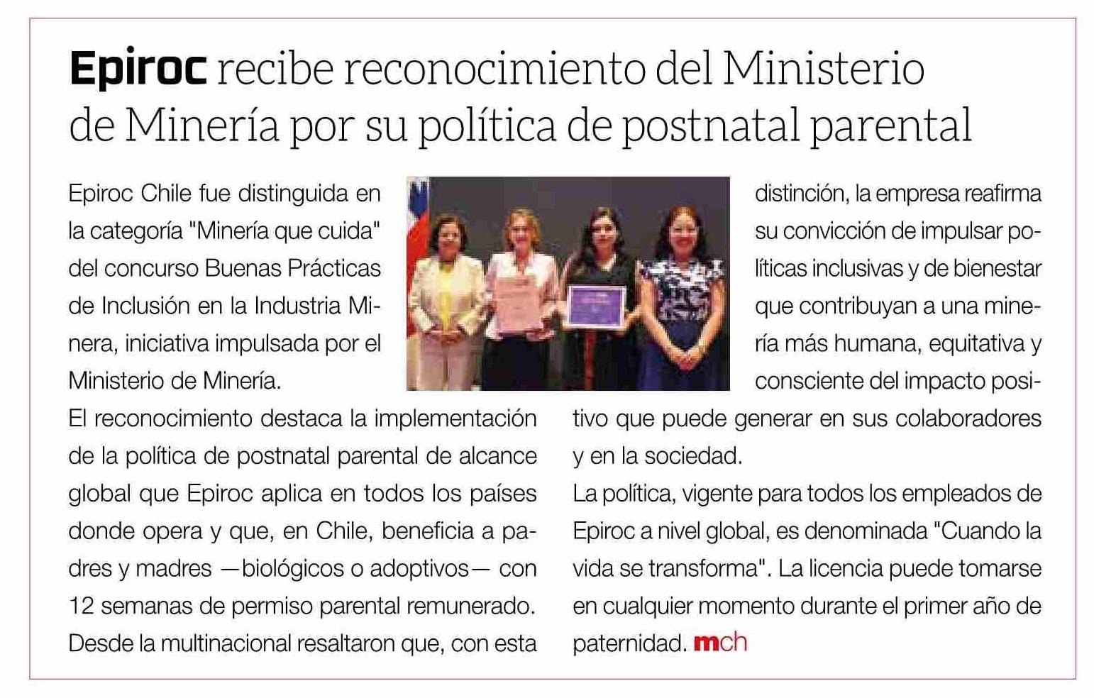 | Título: | Epiroc recibe reconocimiento del Ministerio de Minería por su política de postnatal parental |