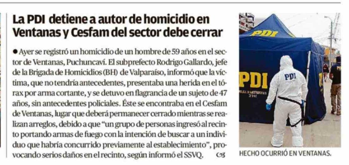 La PDI detiene a autor de homicidio en Ventanas y Cesfam del sector debe cerrar 15-03-2026 El Mercurio de Valparaíso |