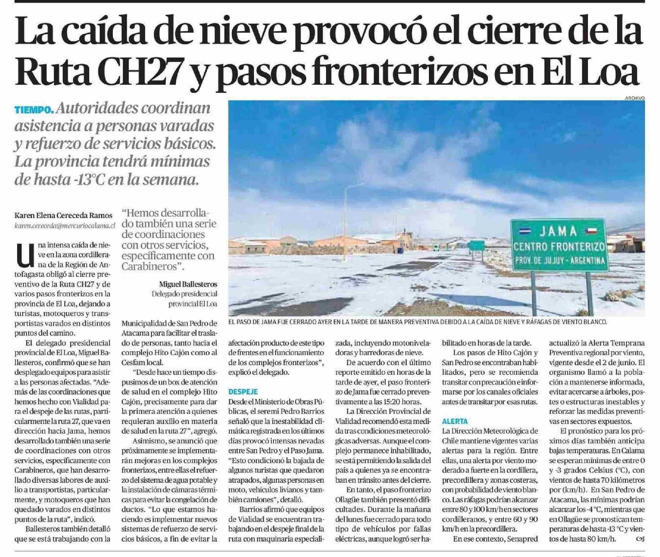 La caída de nieve provocó el cierre de la Ruta CH27 y pasos fronterizos en El Loa 18-06-2025 El Mercurio de Calama |