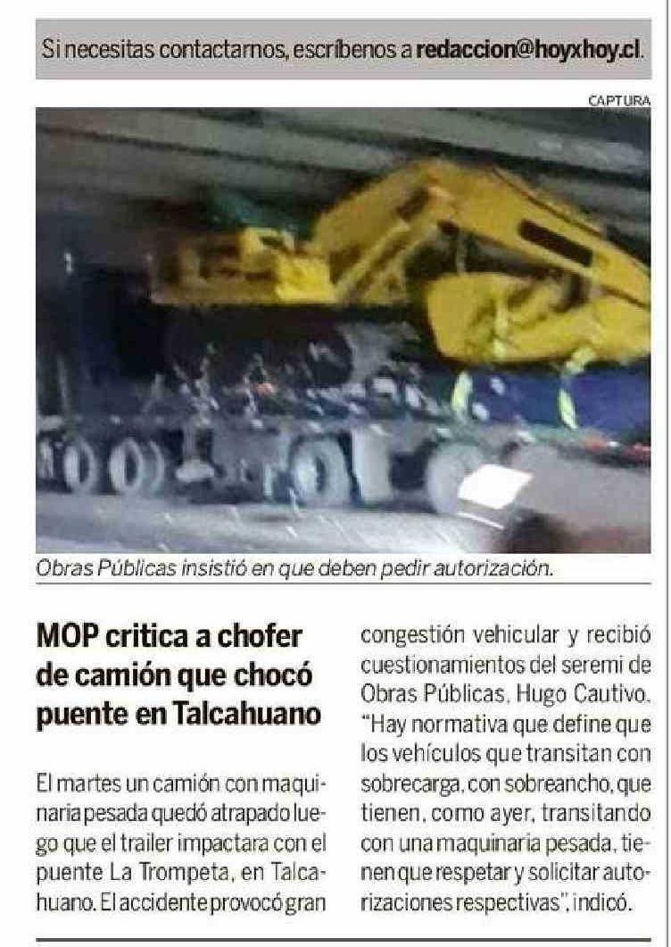 | Título: | MOP critica a chofer de camión que chocó puente en Talcahuano |