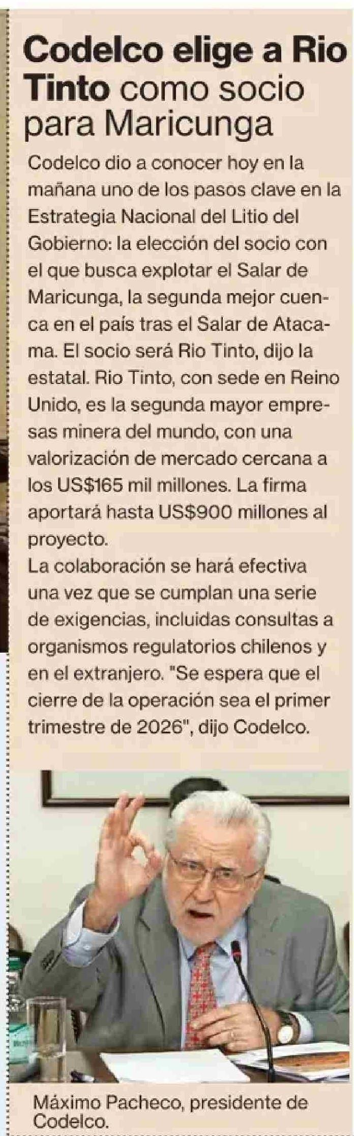 Codelco elige a Rio Tinto como socio para Maricunga 19-05-2025 La Segunda |