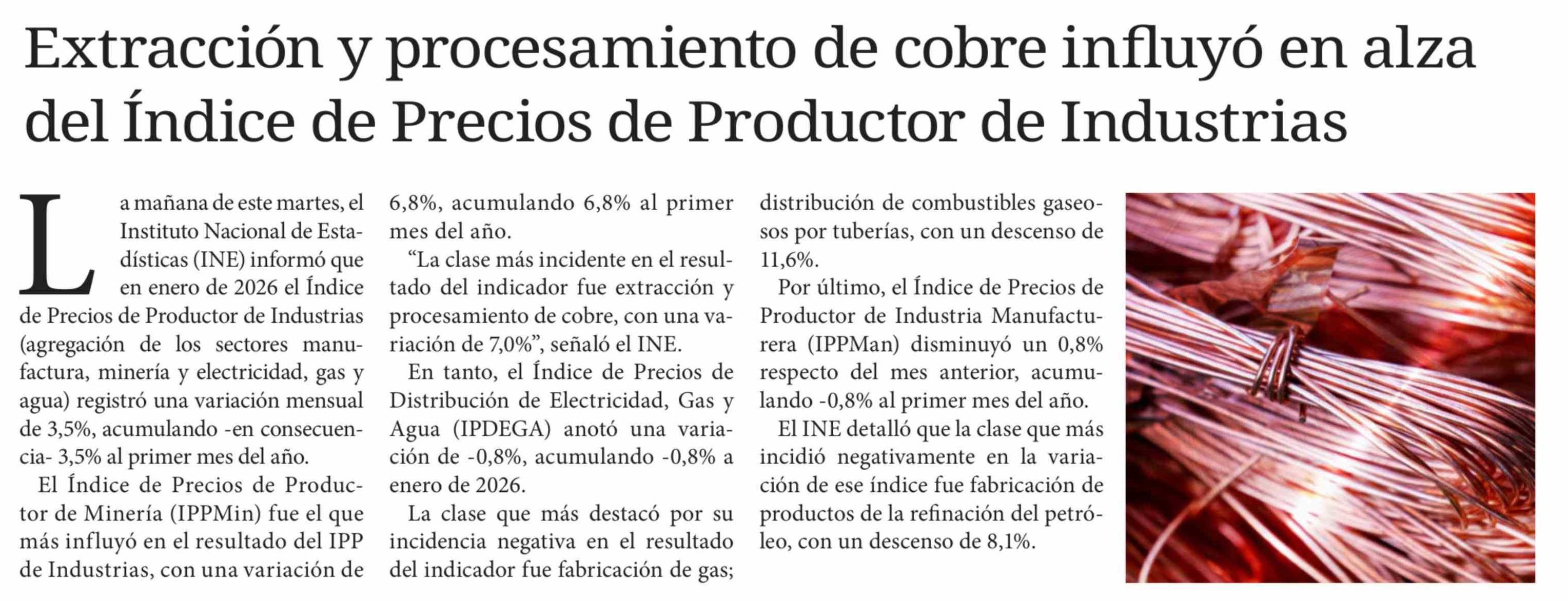 Extracción y procesamiento de cobre influyó en alza del Índice de Precios de Productor de Industrias 25-02-2026 Diario Chañarcillo |