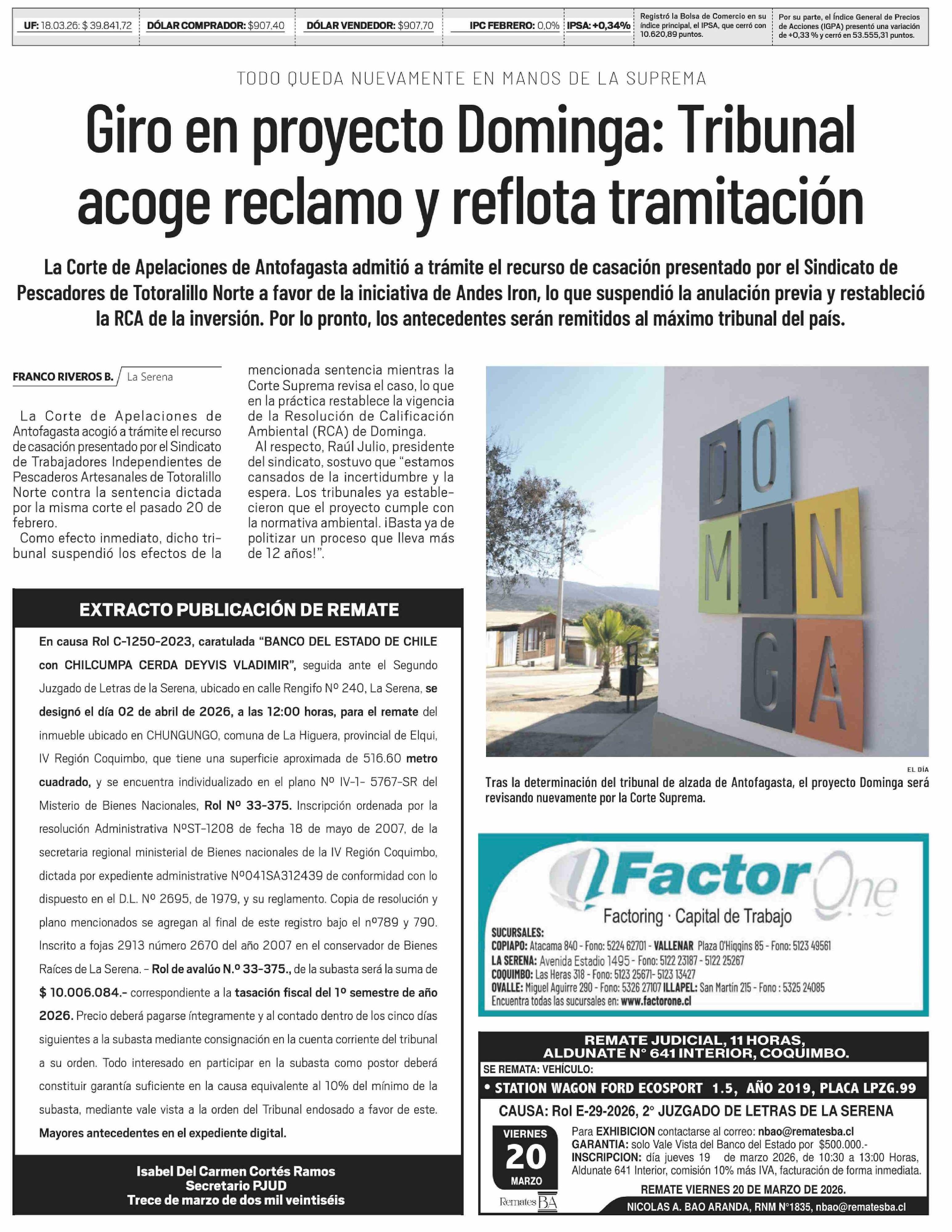 Giro en proyecto Dominga: Tribunal acoge reclamo y reflota tramitación 18-03-2026 El Día |
