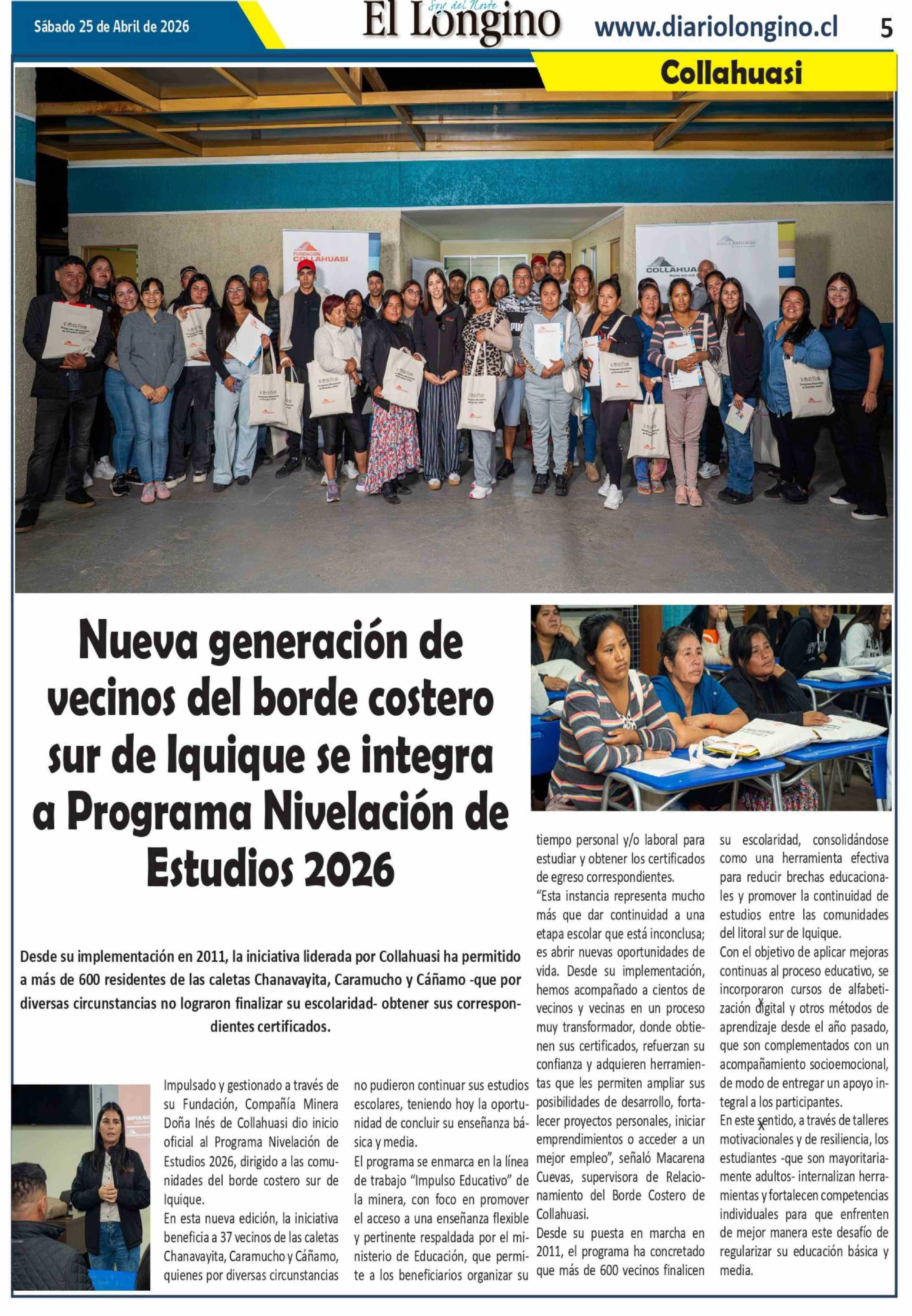 Nueva generación de vecinos del borde costero sur de Iquique se integra a Programa Nivelación de Estudios 2026 25-04-2026 El Longino |
