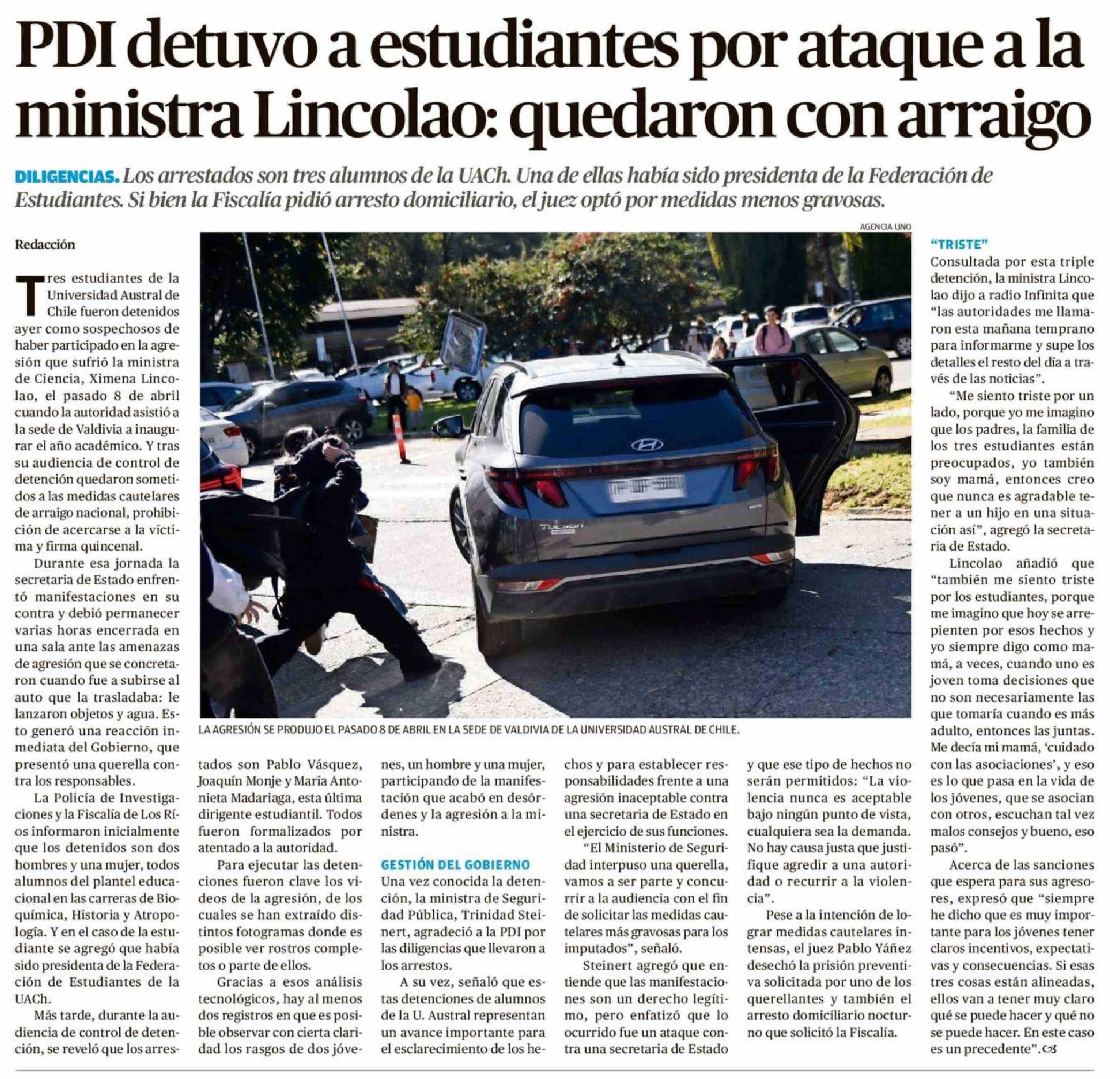 PDI detuvo a estudiantes por ataque a la ministra Lincolao: quedaron con arraigo 21-04-2026 Crónica de Chillán |