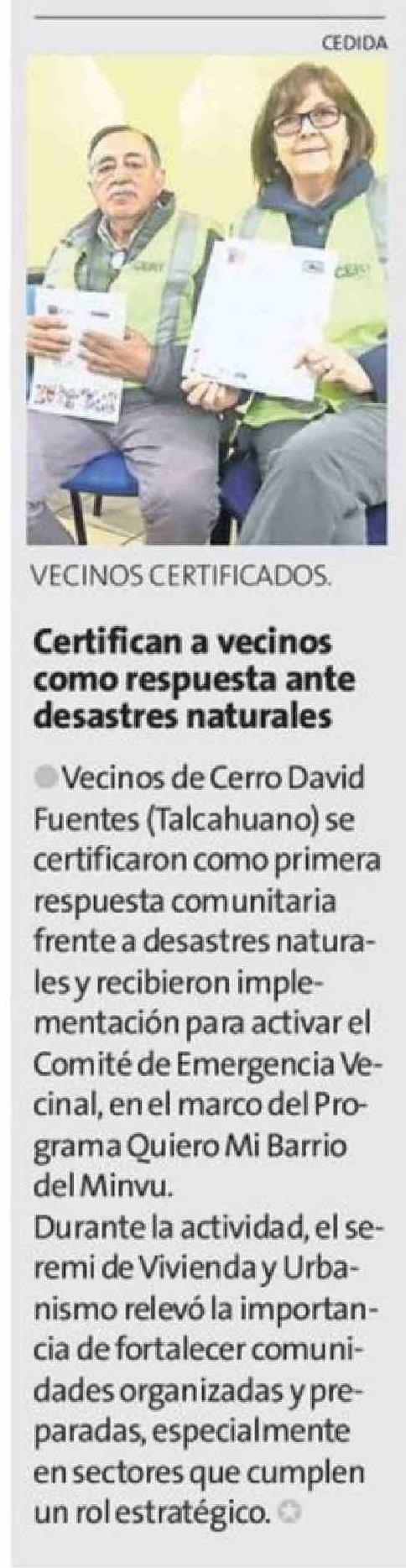 | Título: | Certifican a vecinos como respuesta ante desastres naturales |