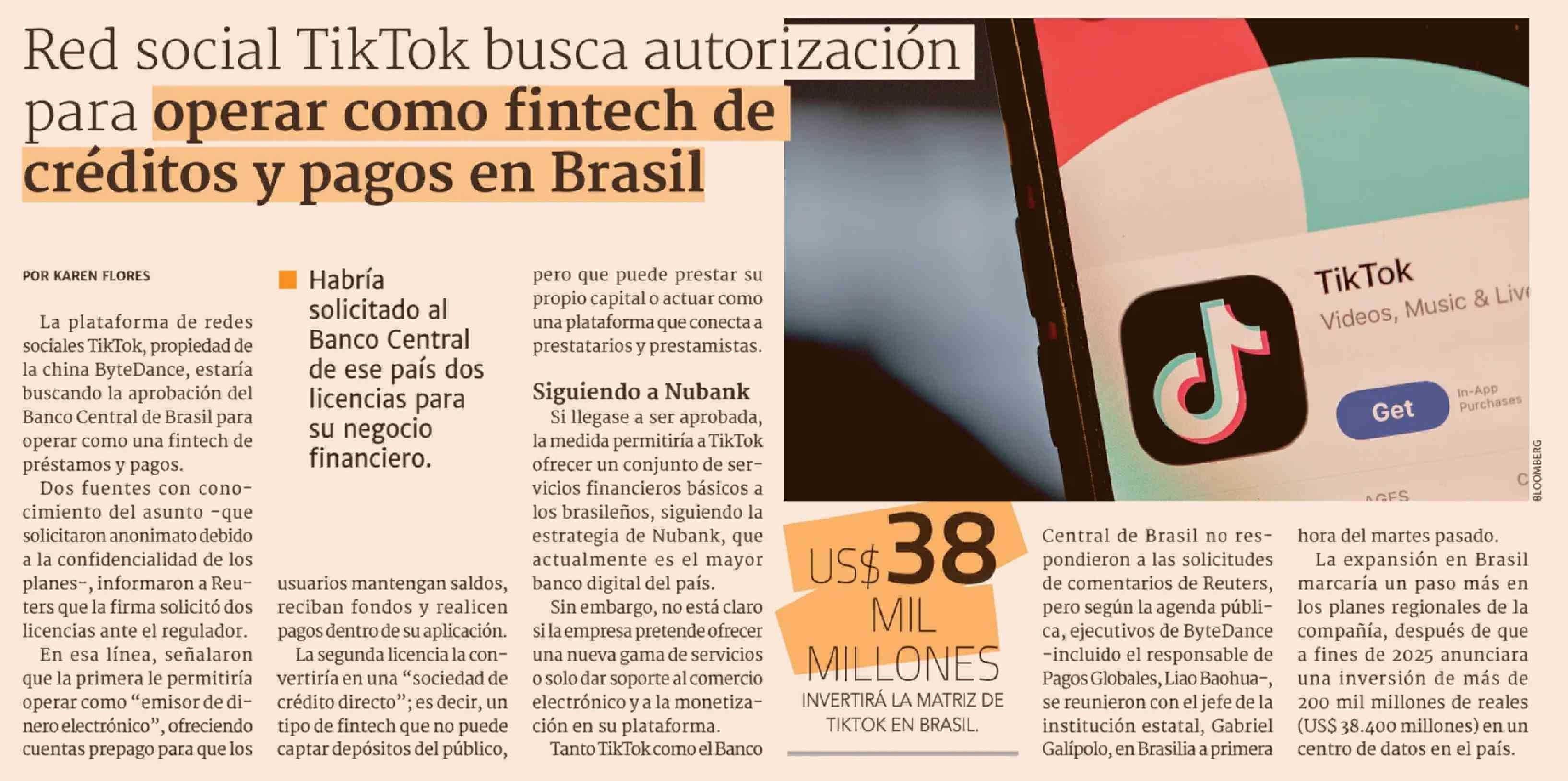 Red social TikTok busca autorización para operar como fintech de créditos y pagos en Brasil 02-04-2026 Diario Financiero |