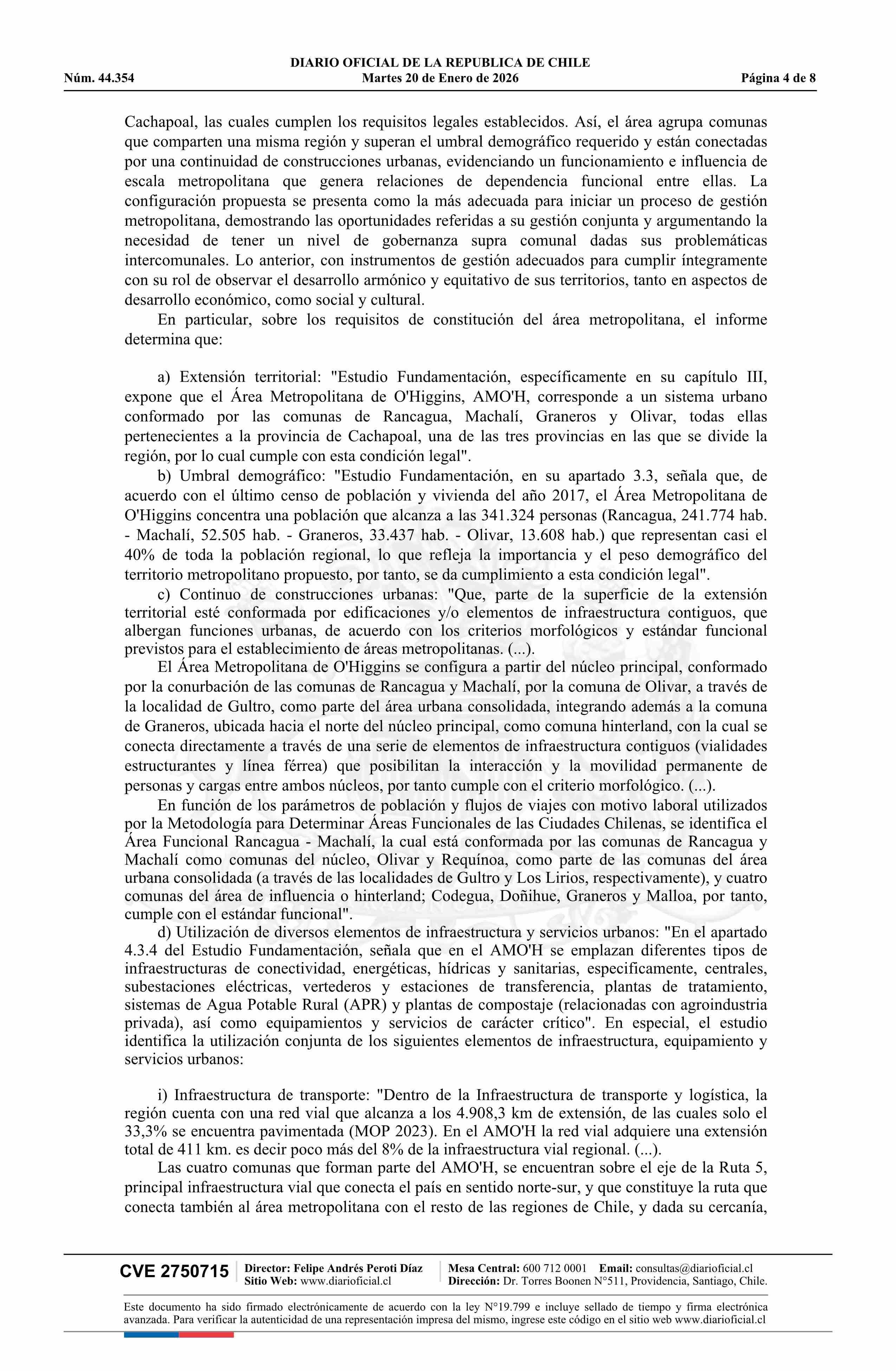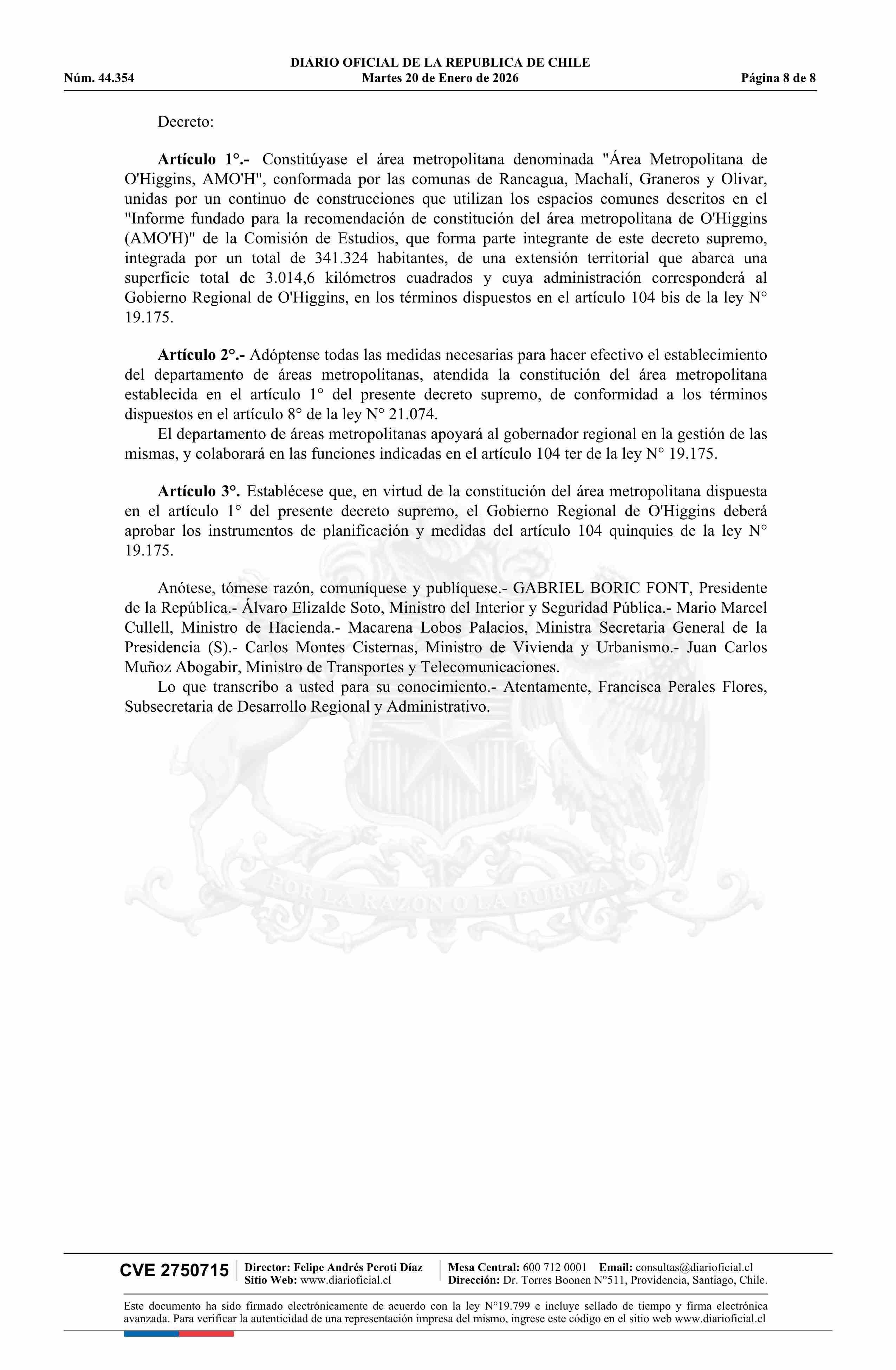 Decreto número 86, de 2025.- Constituye Área Metropolitana de O'Higgins