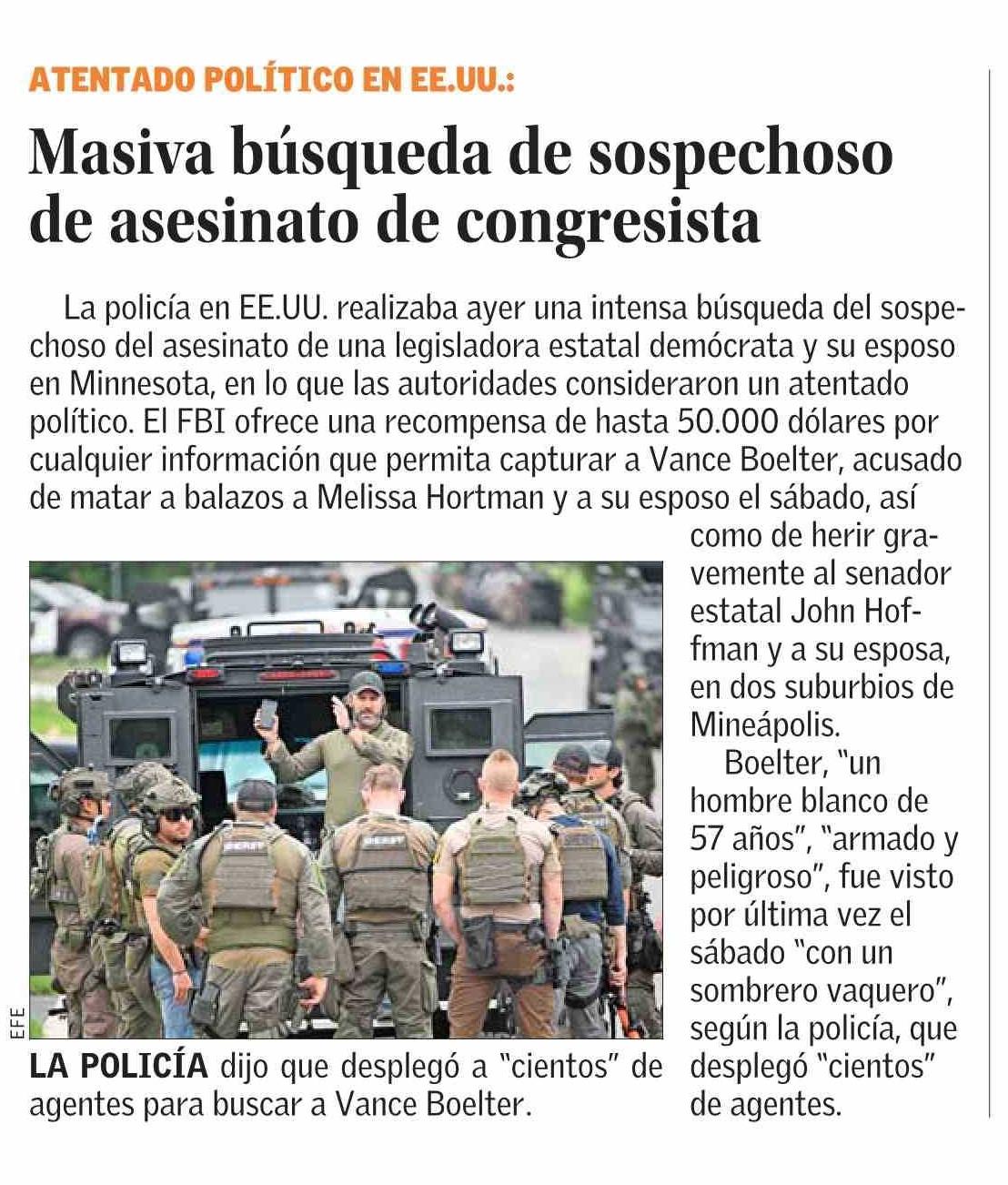 Masiva búsqueda de sospechoso de asesinato de congresista 16-06-2025 El Mercurio |