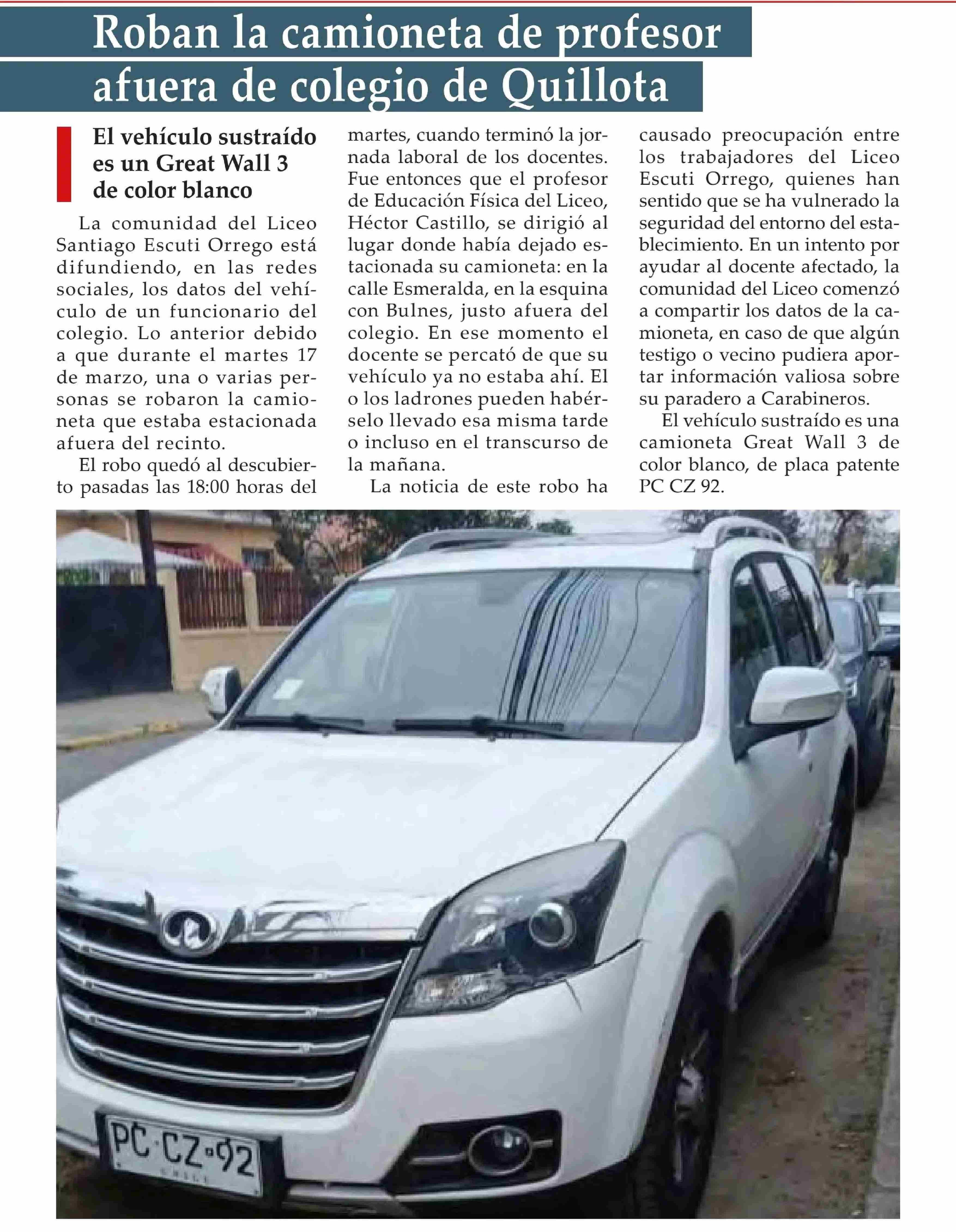 | Título: | Roban la camioneta de profesor afuera de colegio de Quillota |