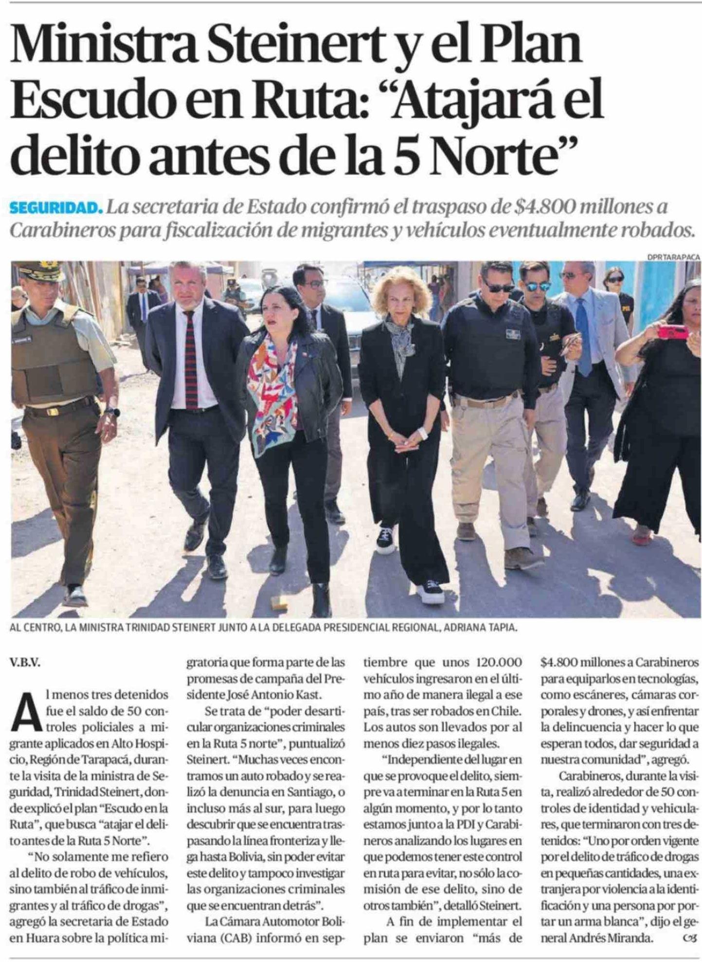 Ministra Steinert y el Plan Escudo en Ruta: “Atajará el delito antes de la 5 Norte” 13-04-2026 El Diario de Atacama |