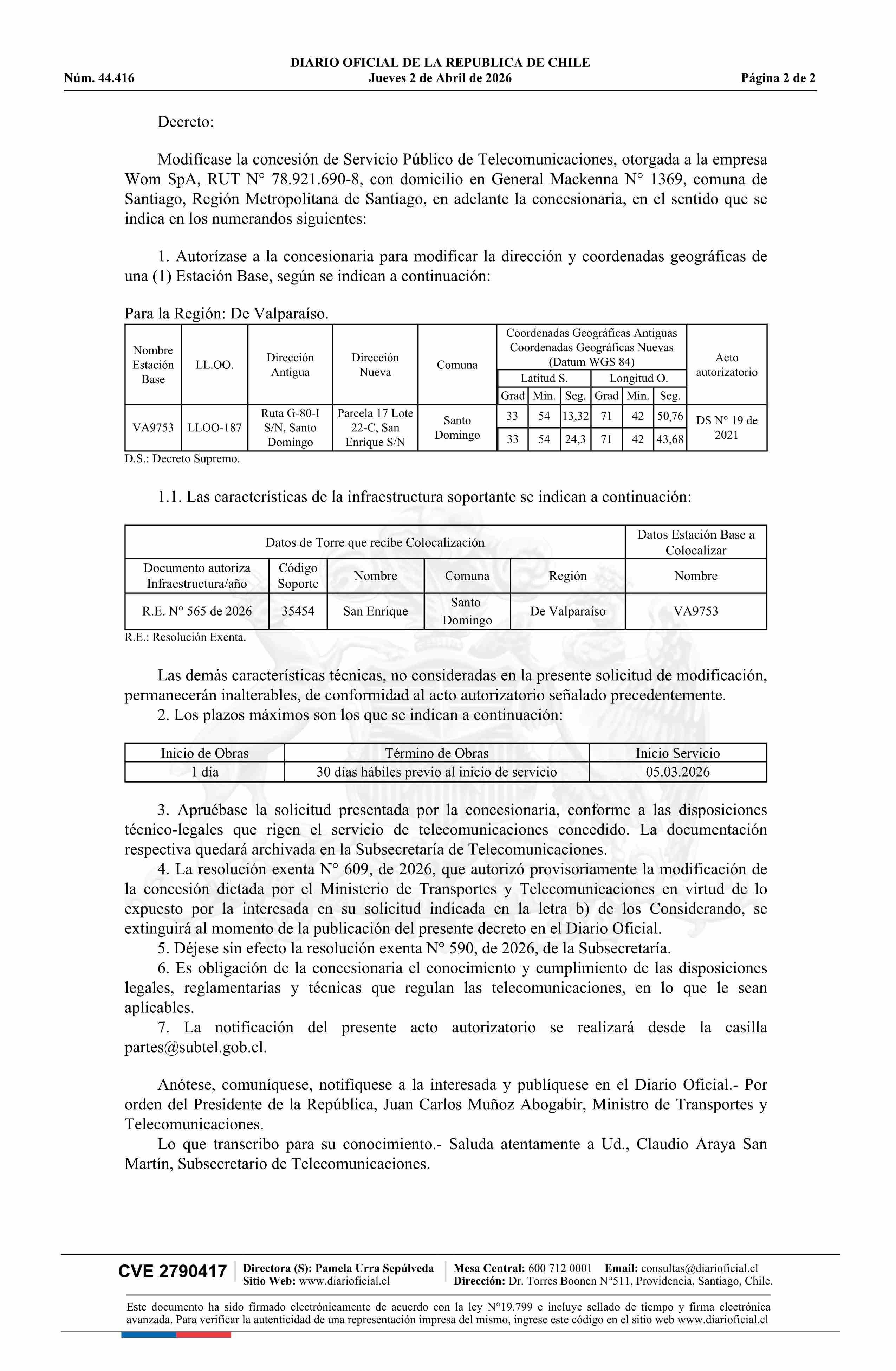 Título: Decreto exento número 241, de 2026.- Modifica concesión de servicio público de telecomunicaciones a la empresa Wom SpA