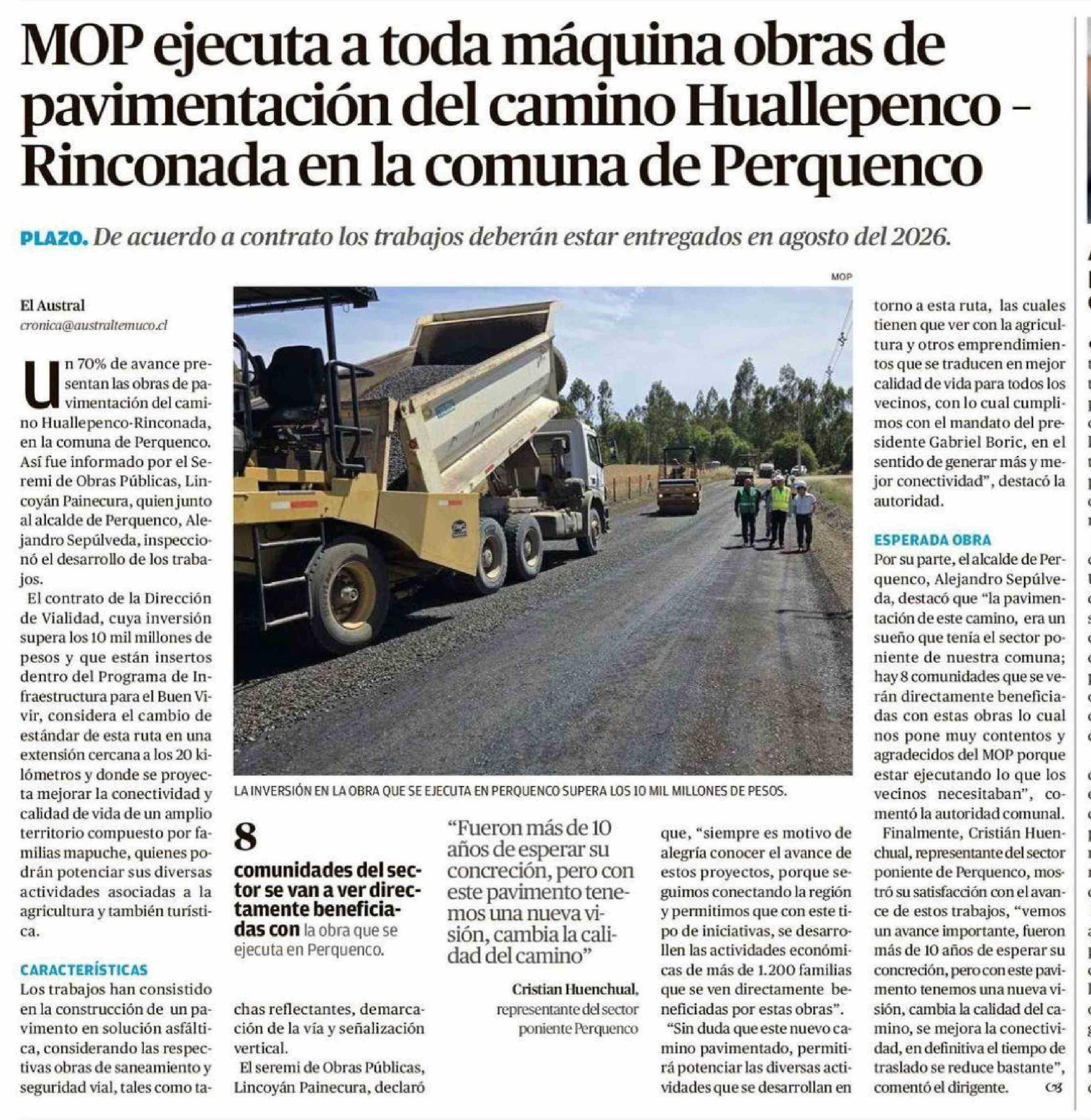 MOP ejecuta a toda máquina obras de pavimentación del camino Huallepenco Rinconada en la comuna de Perquenco 12-01-2026 El Austral de la Araucanía |
