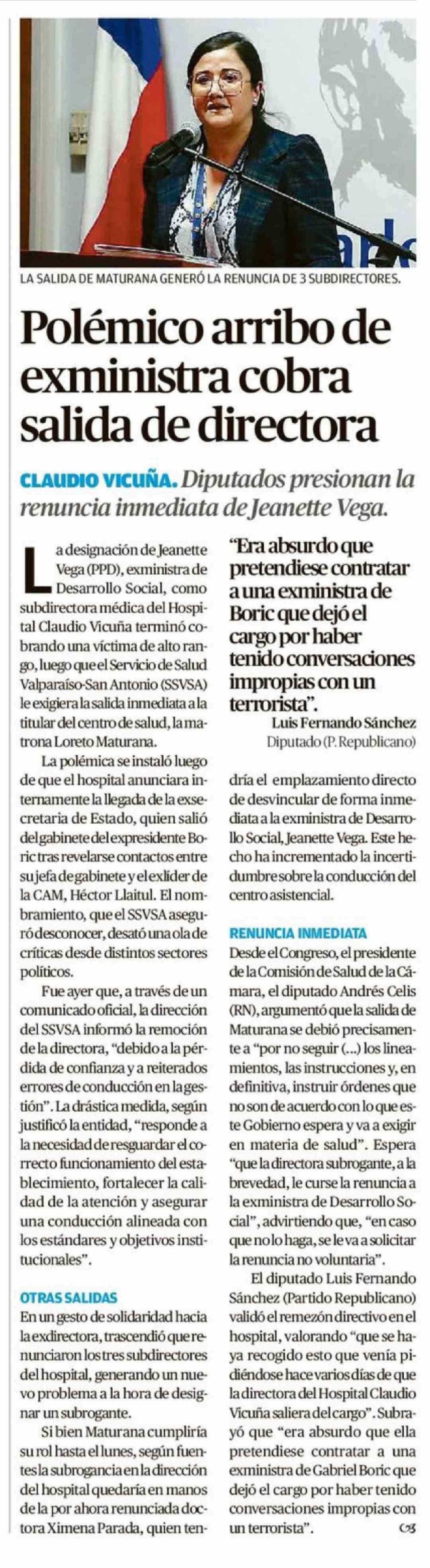 Polémico arribo de exministra cobra salida de directora 24-04-2026 El Mercurio de Valparaíso |