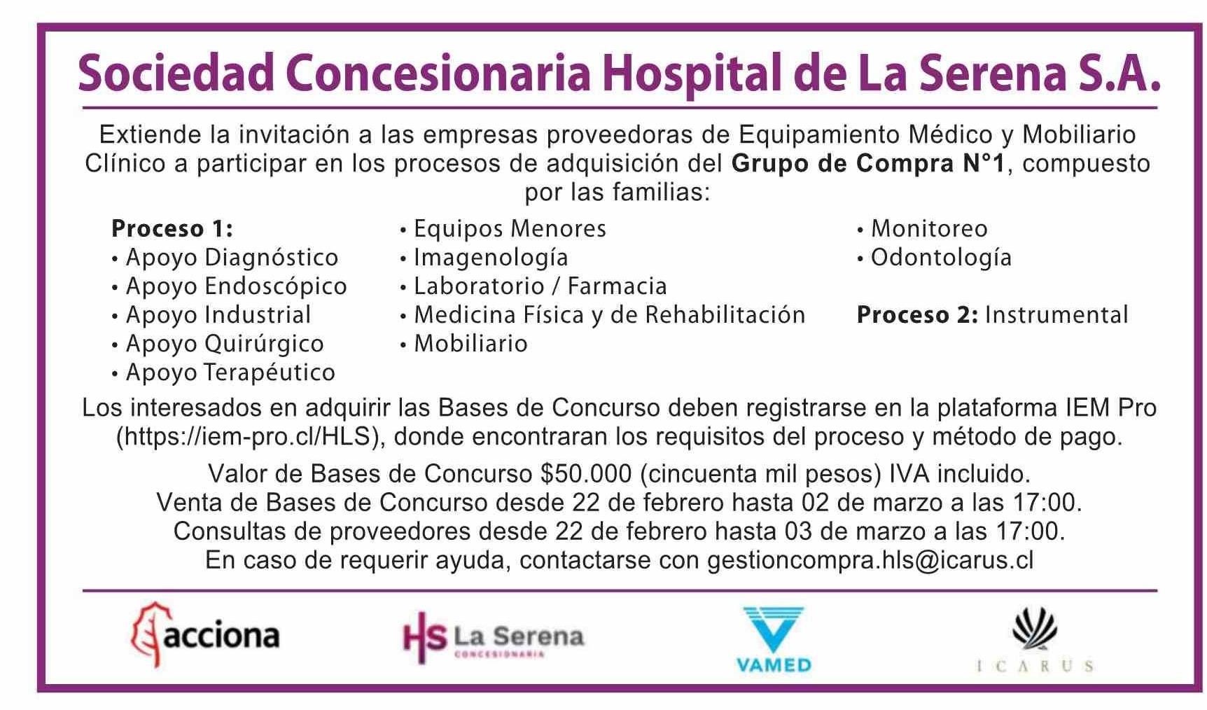 AVISO LICITACIONES: Sociedad Concesionaria Hospital de La Serena S.A.