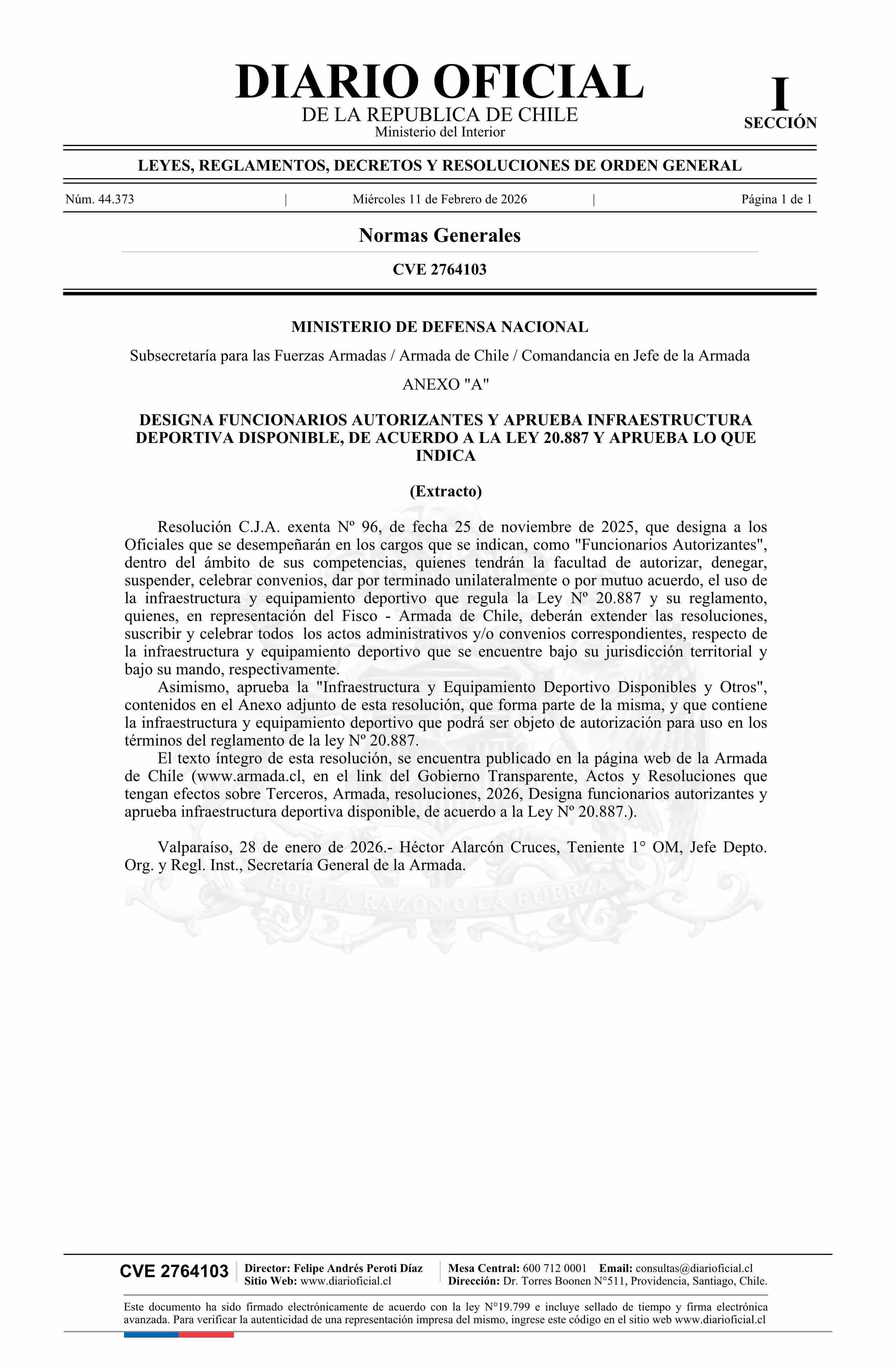 Título: Extracto de resolución exenta número 96, de 2025.- Designa funcionarios autorizantes y aprueba infraestructura deportiva disponible, de acuerdo a la ley 20.887 y aprueba lo que indica