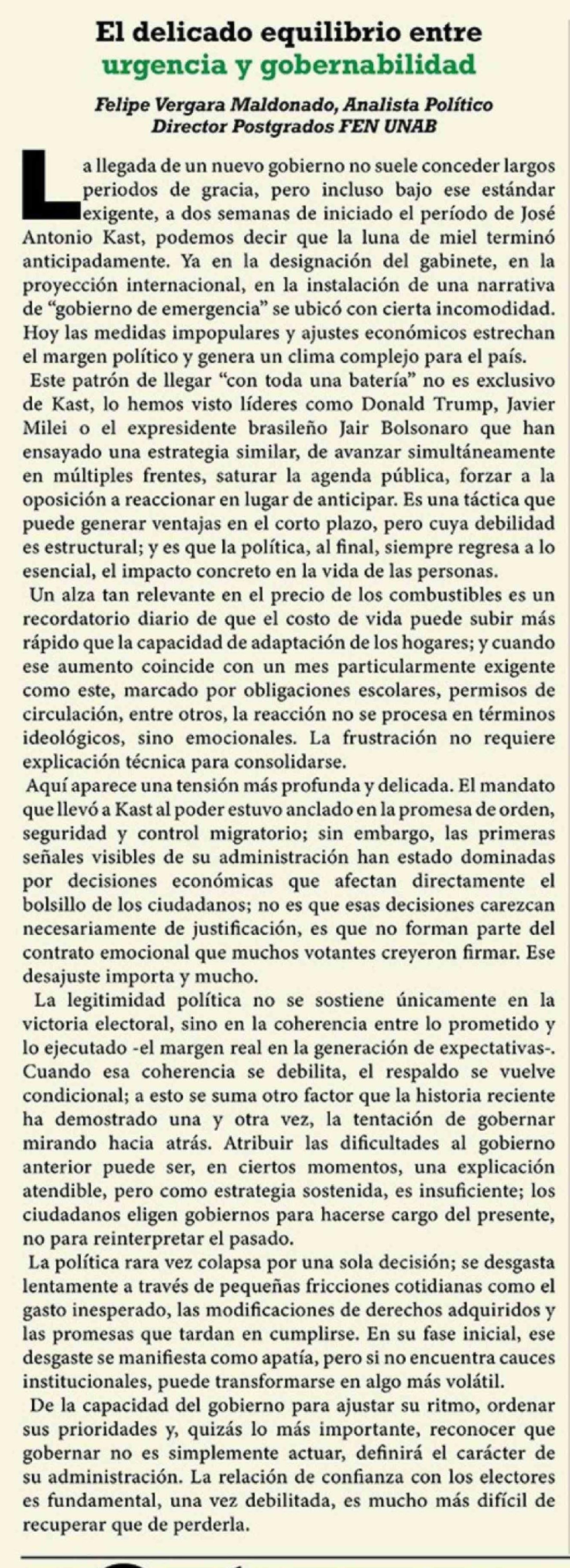 | Título: | Columnas de Opinión: El delicado equilibrio entre urgencia y gobernabilidad |