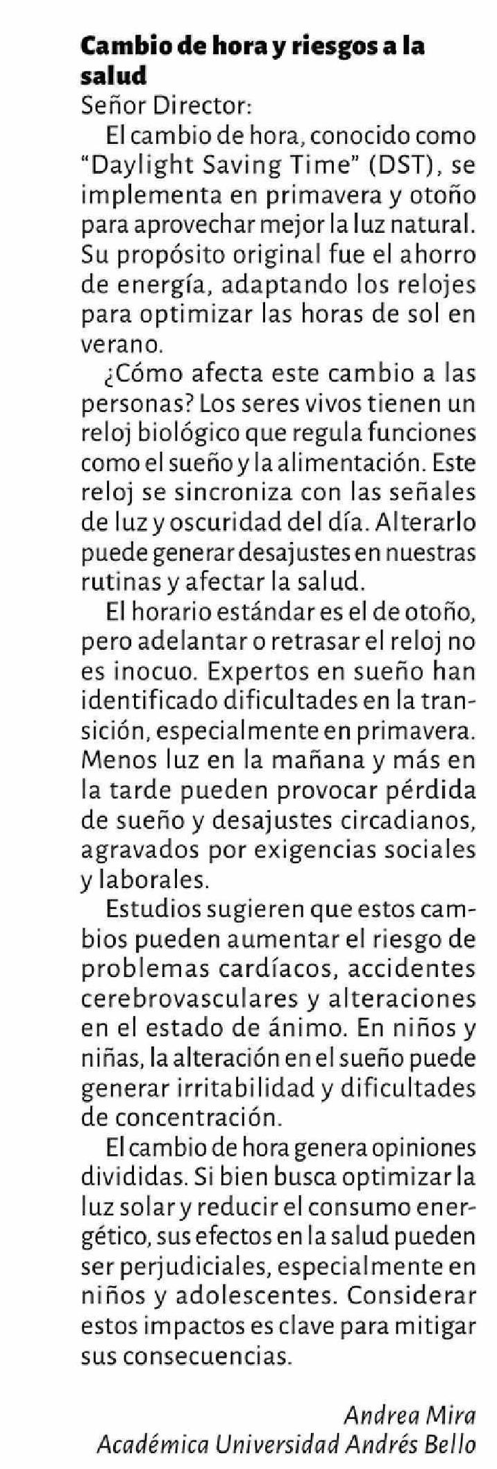 | Título: | CARTAS: Cambio de hora y riesgos a la salud |
