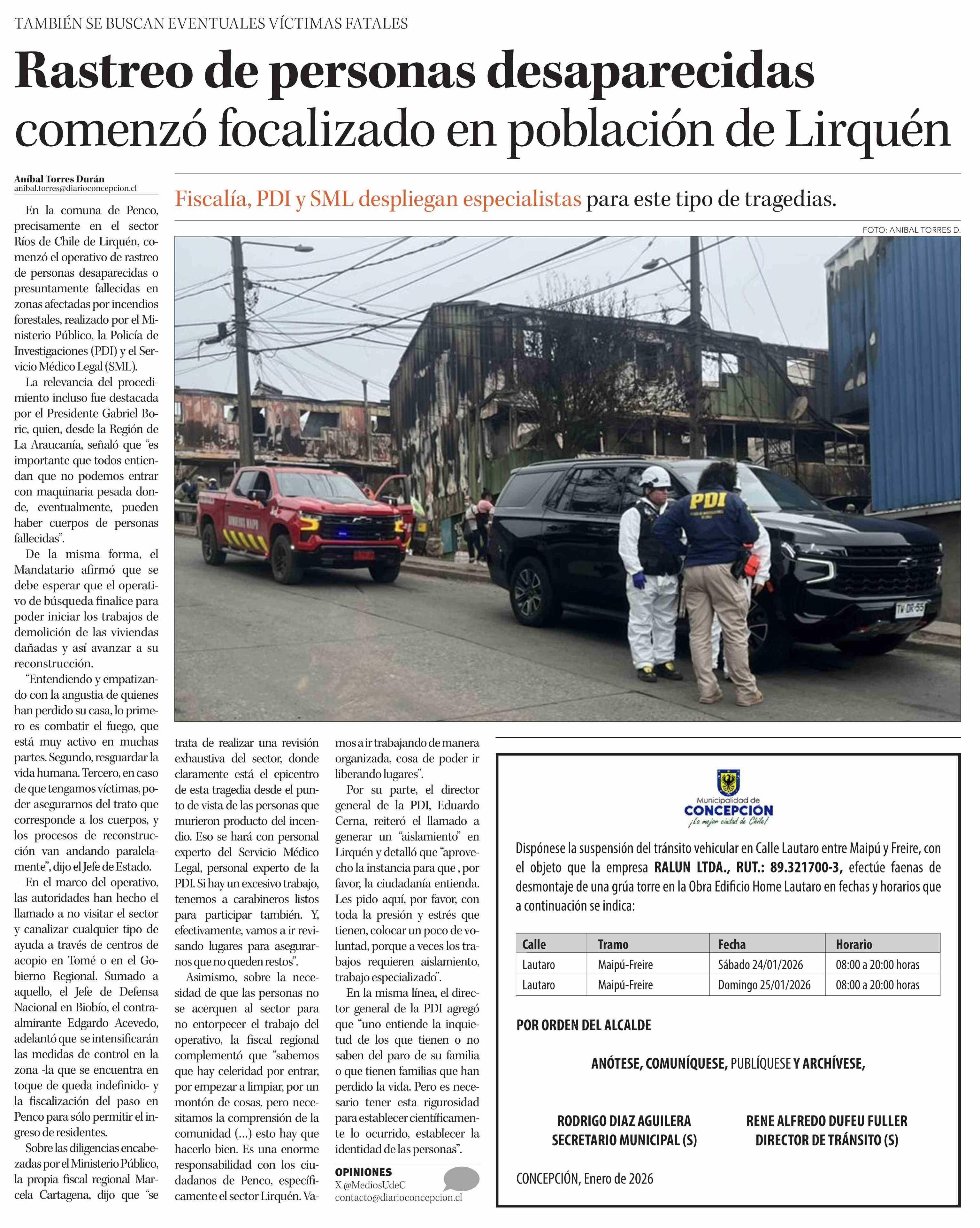 Rastreo de personas desaparecidas comenzó focalizado en población de Lirquén 21-01-2026 Diario Concepción |
