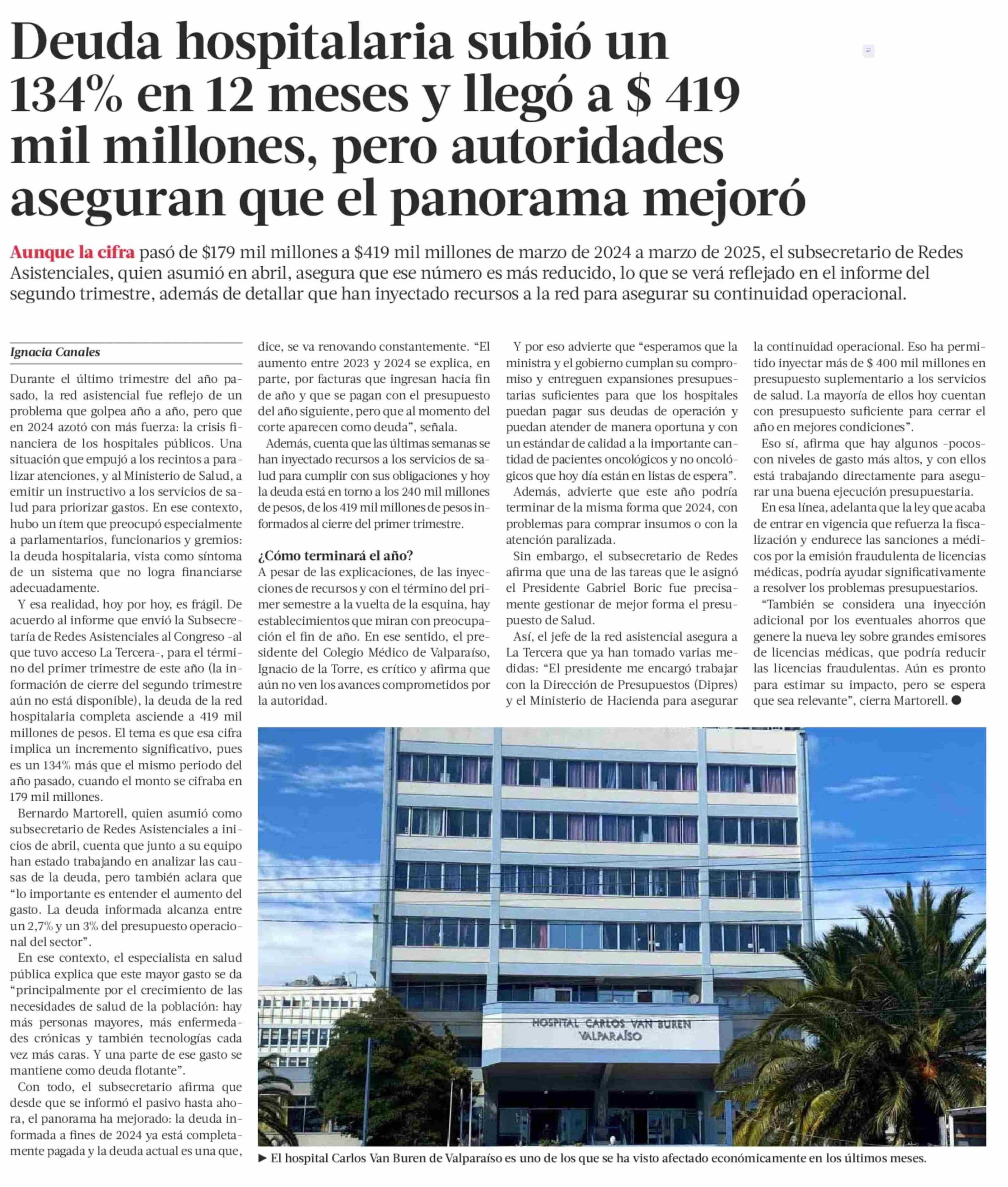 Título: Deuda hospitalaria subió un 134% en 12 meses y llegó a $ 419 mil millones, pero autoridades aseguran que el panorama mejoró