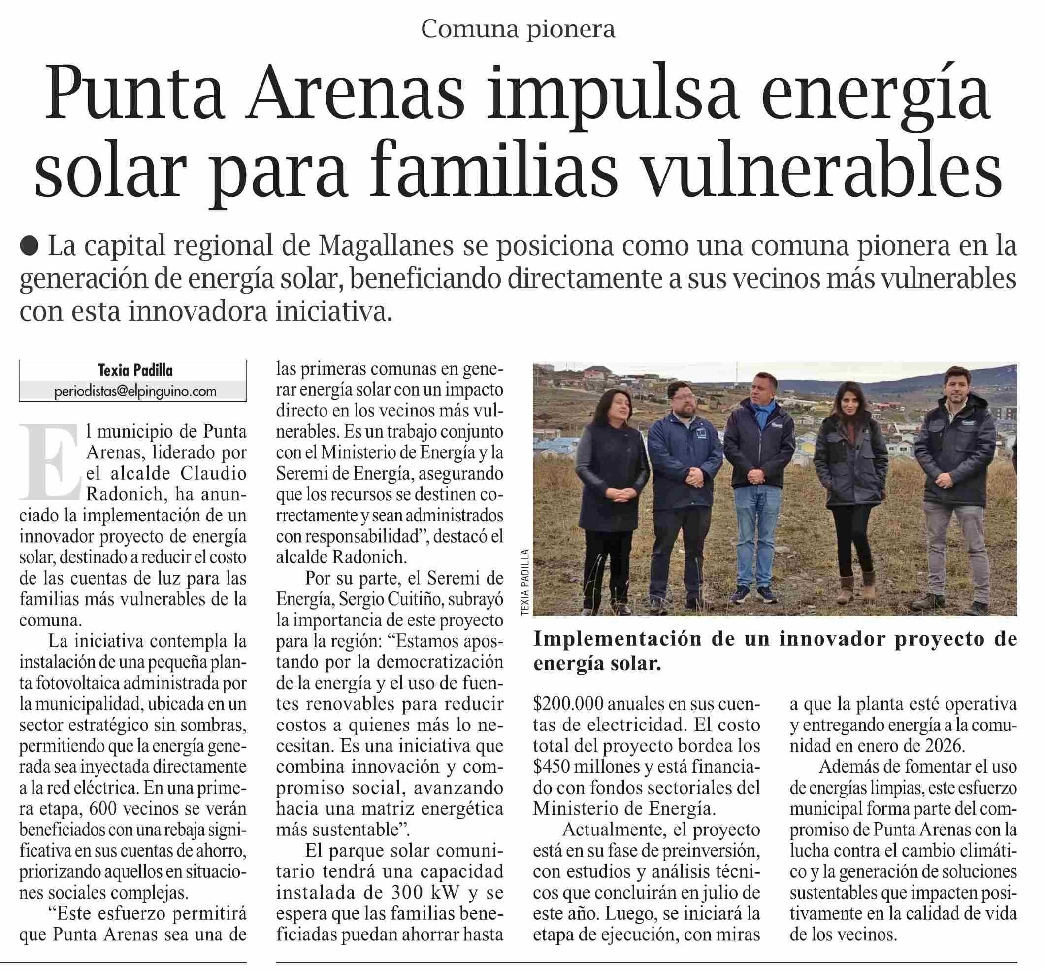 Punta Arenas impulsa energía solar para familias vulnerables 14-06-2025 El Pingüino |