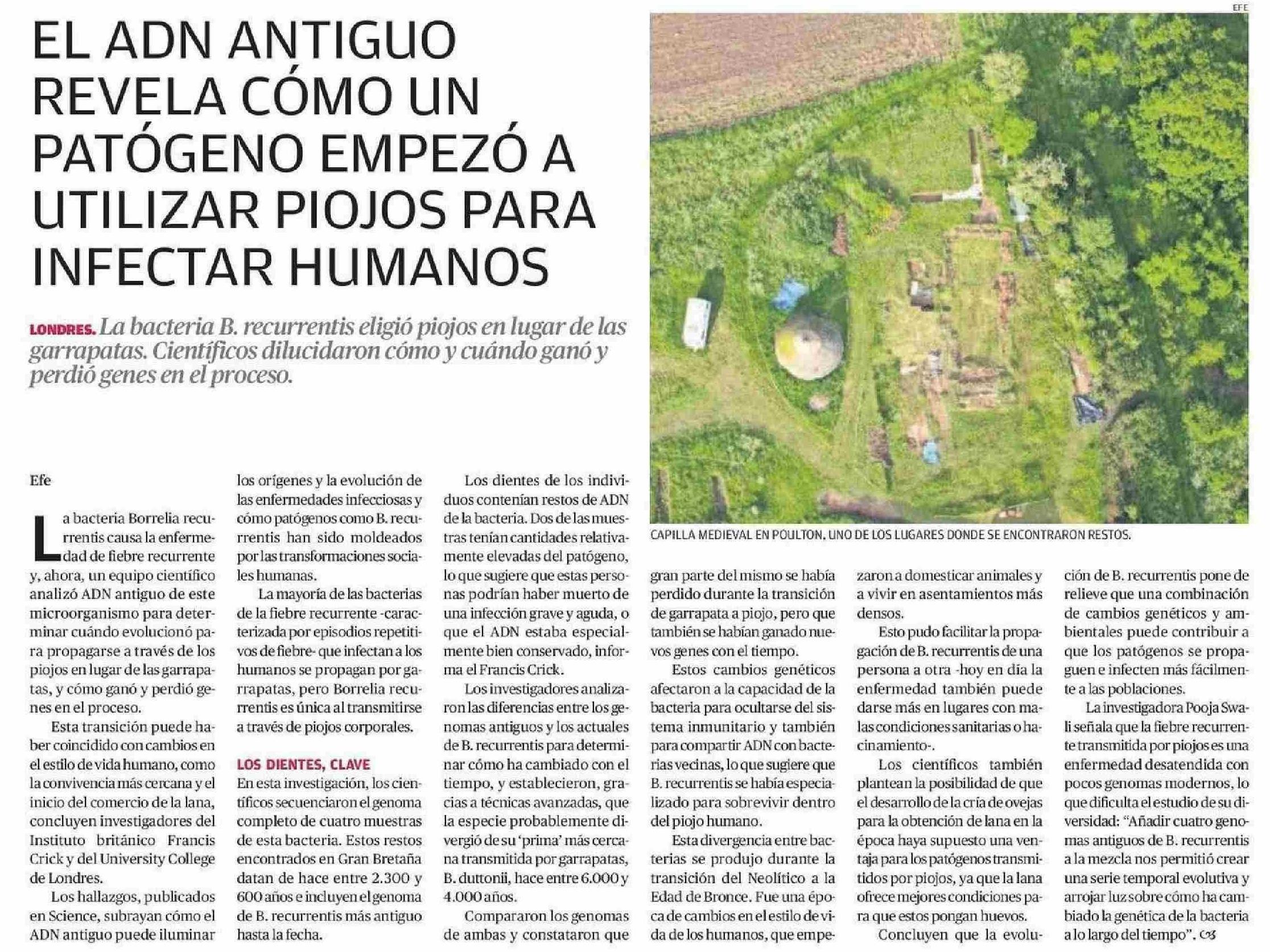 EL ADN ANTIGUO REVELA CÓMO UN PATÓGENO EMPEZÓ A UTILIZAR PIOJOS PARA INFECTAR HUMANOS 23-05-2025 El Mercurio de Antofagasta |