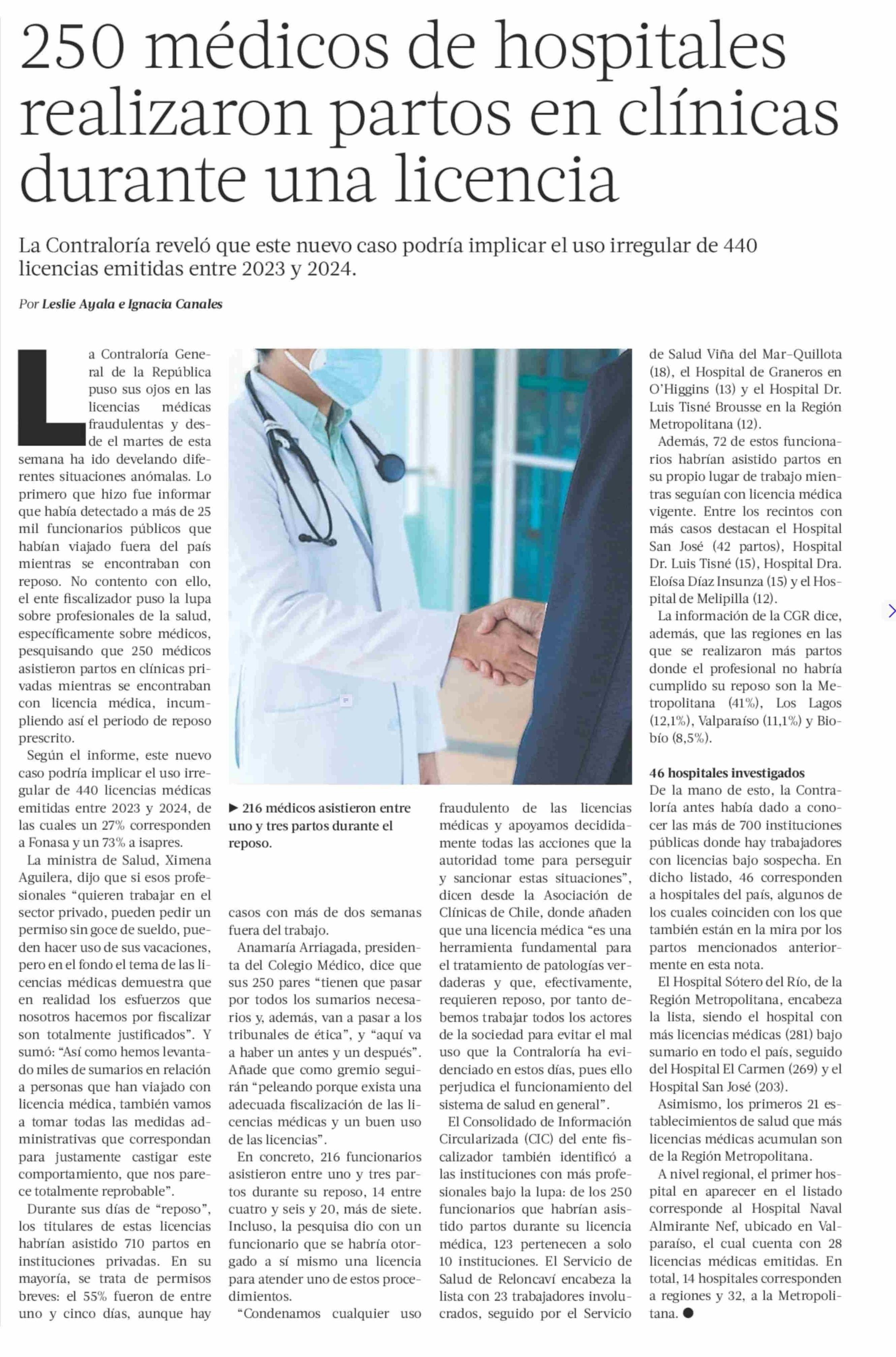 250 médicos de hospitales realizaron partos en clínicas durante una licencia 24-05-2025 La Tercera |