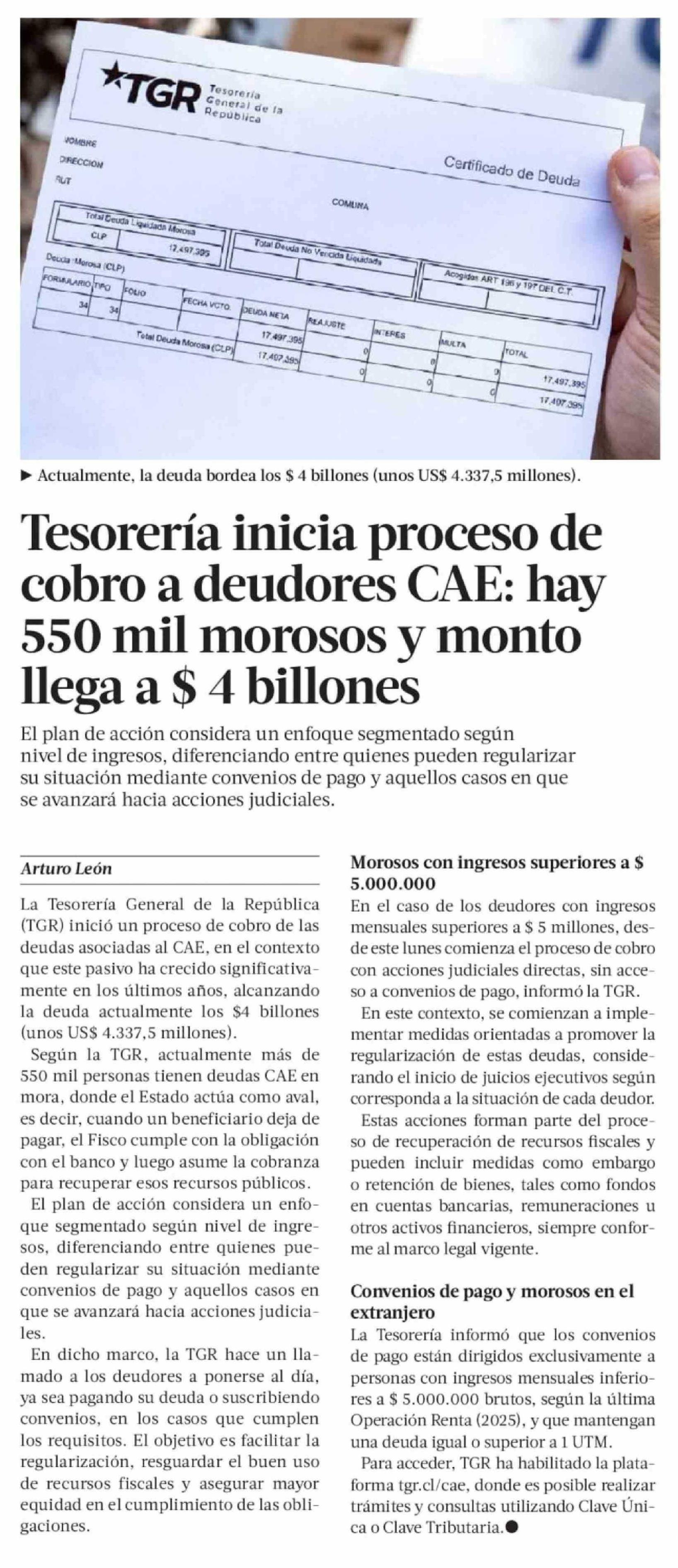 Título: Tesorería inicia proceso de cobro a deudores CAE: hay 550 mil morosos y monto llega a $ 4 billones