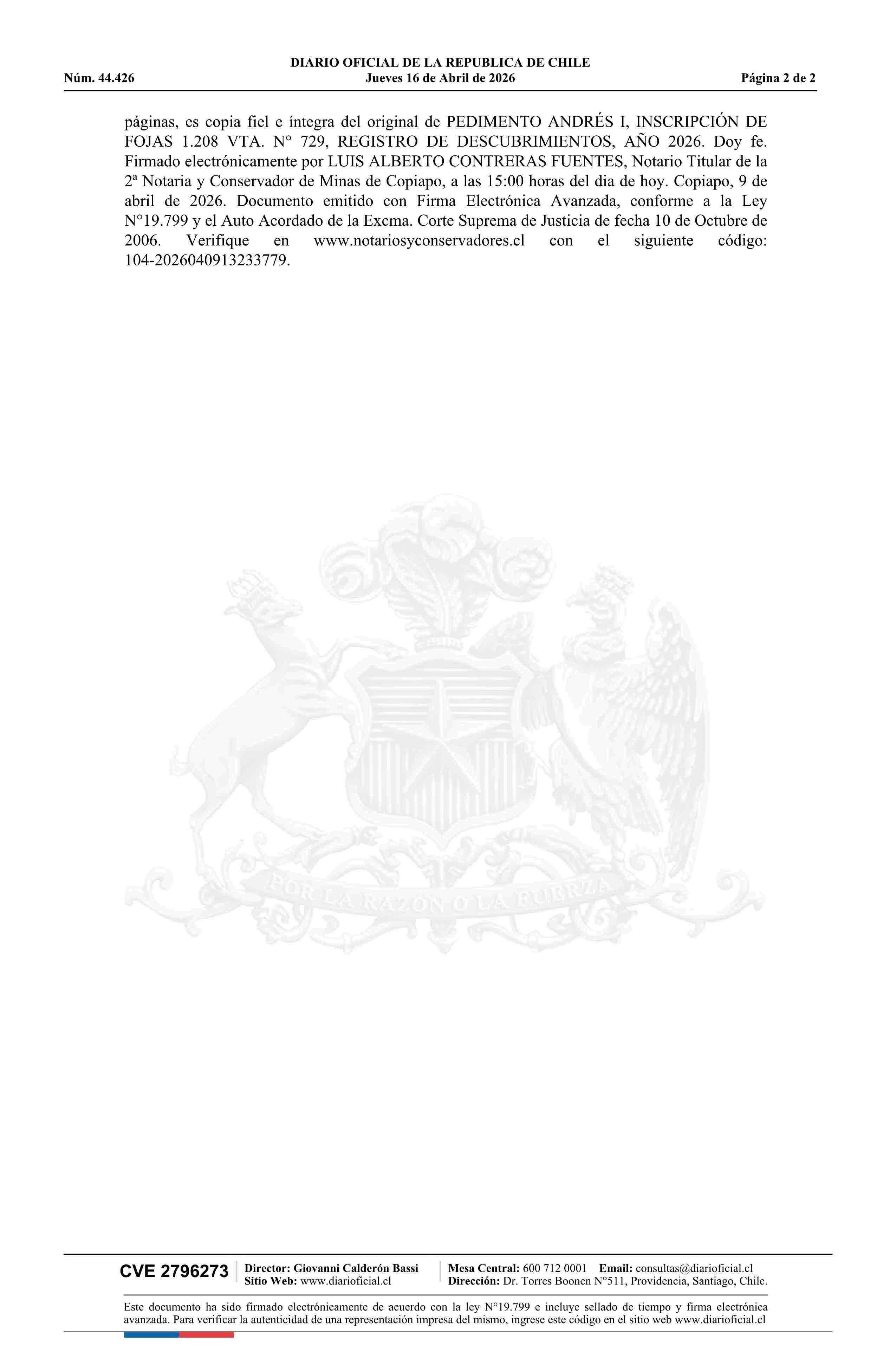 ANDRÉS I / Compañía Minera Minerales Copiapó Limitada 16-04-2026 DIARIO OFICIAL CHILE - BOLETÍN OFICIAL DE MINERÍA |
