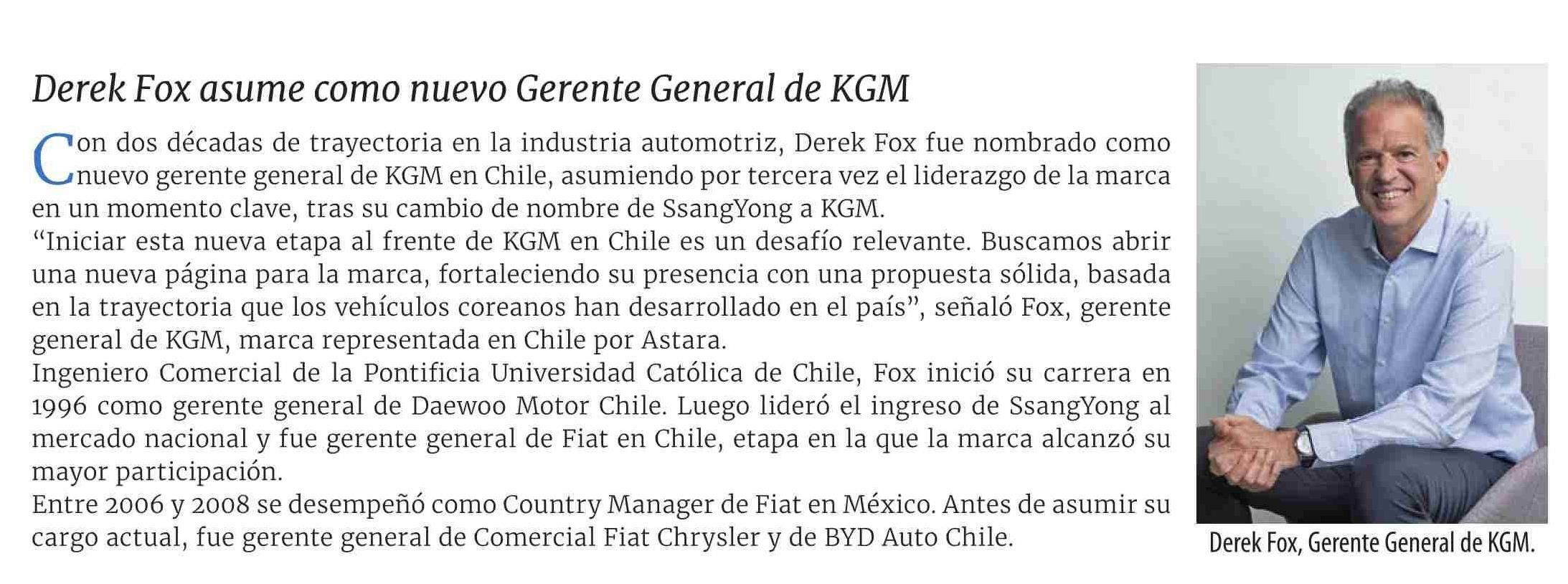 | Título: | Derek Fox asume como nuevo Gerente General de KGM |