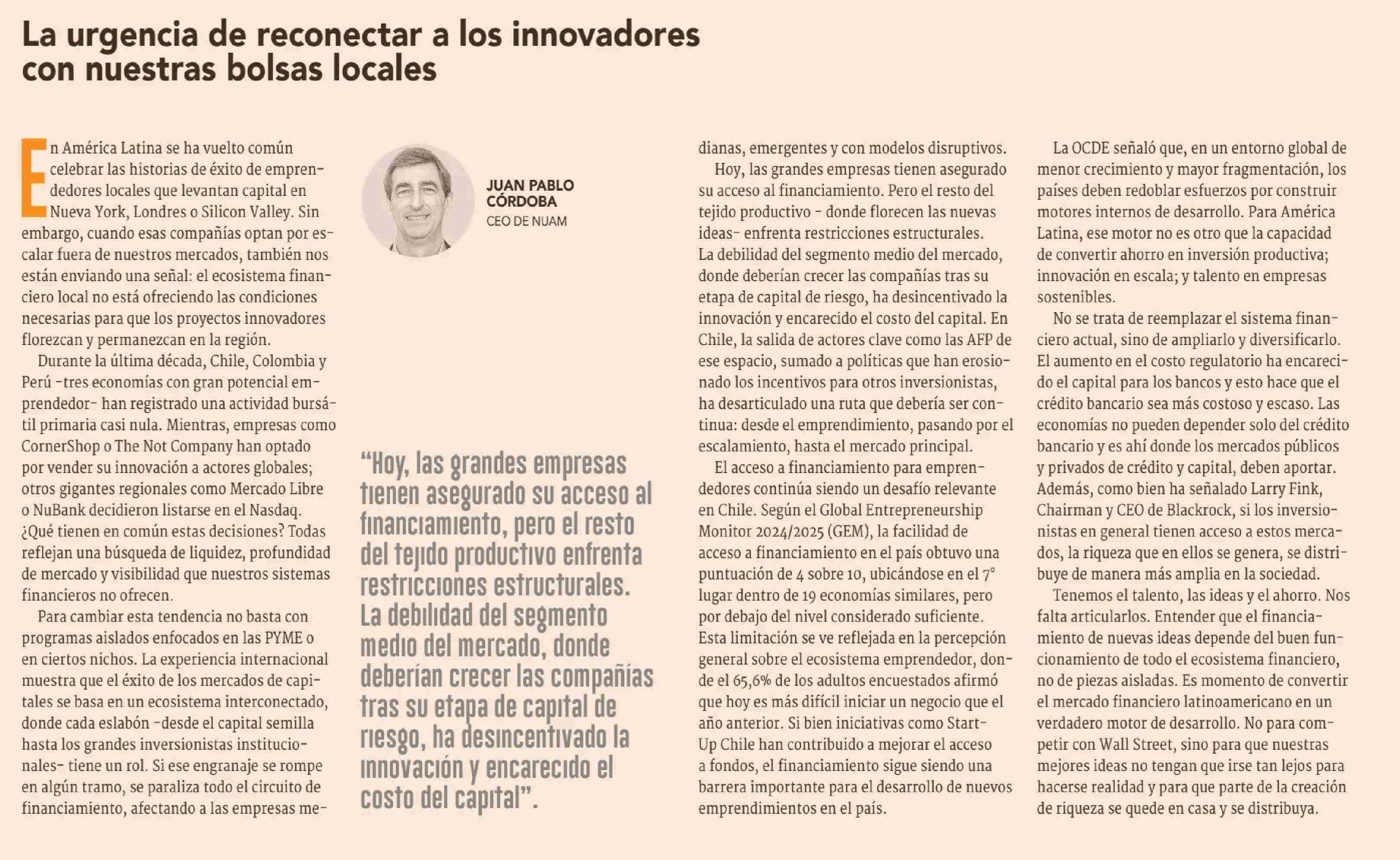 Título: COLUMNAS DE OPINIÓN: La urgencia de reconectar a los innovadores con nuestras bolsas locales