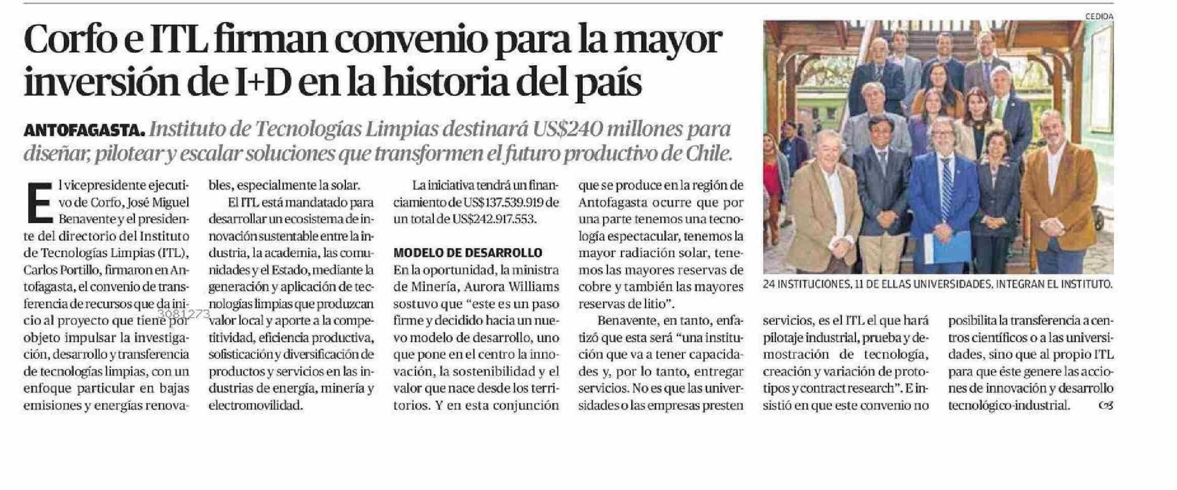 Corfo e ITL firman convenio para la mayor inversión de I+D en la historia del país 25-06-2025 El Mercurio de Calama |