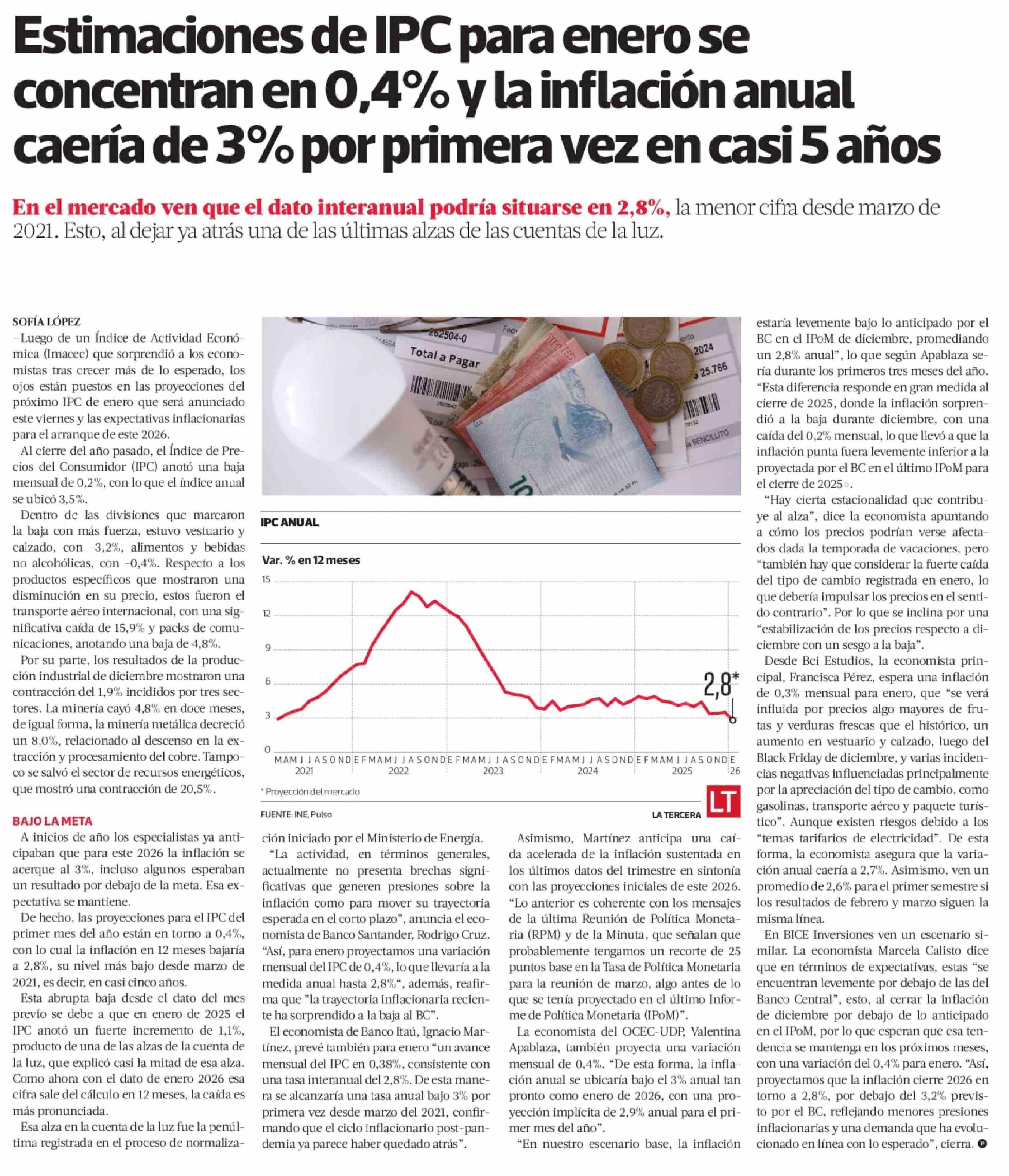Estimaciones de IPC para enero se concentran en 0,4% y la inflación anual caería de 3% por primera vez en casi 5 años 05-02-2026 La Tercera |