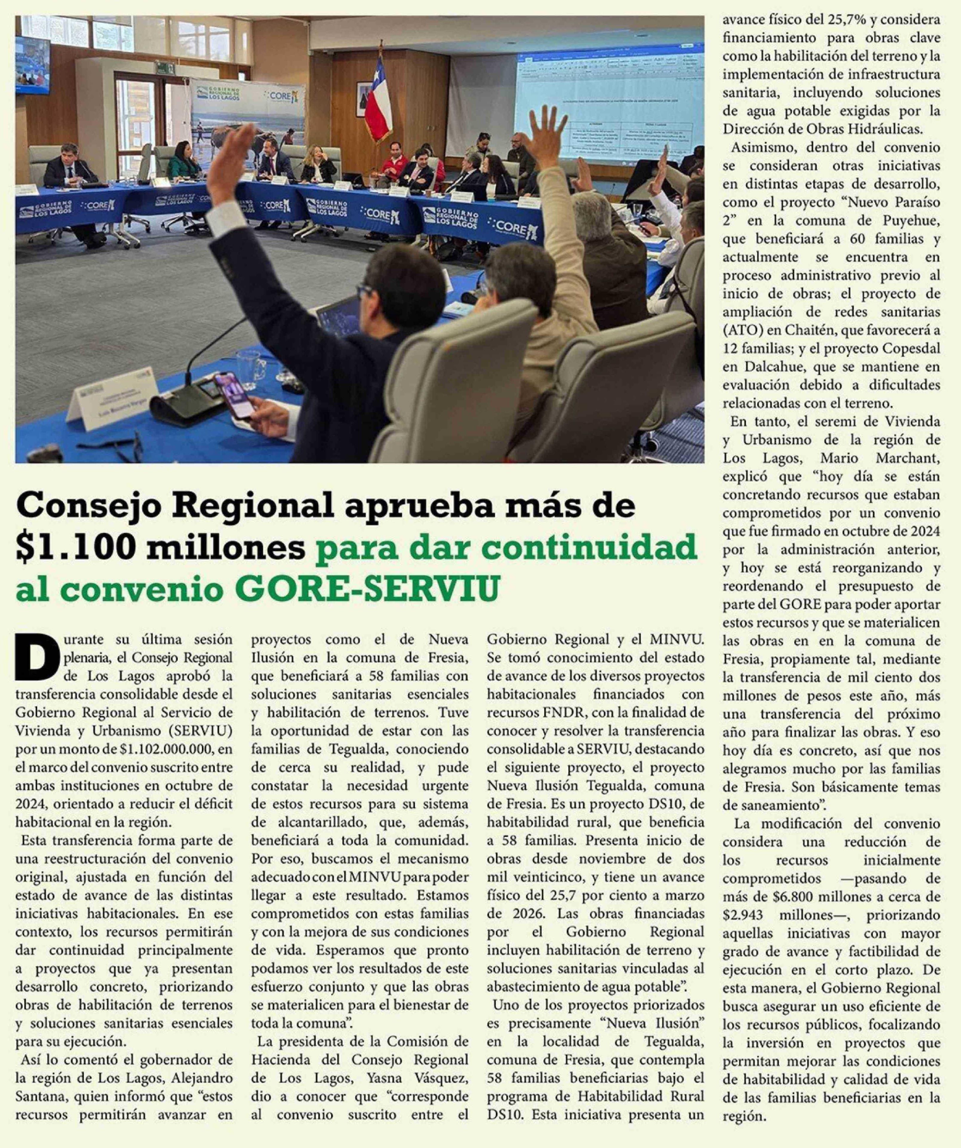 Consejo Regional aprueba más de $1.100 millones para dar continuidad al convenio GORE-SERVIU 25-04-2026 El Heraldo Austral |