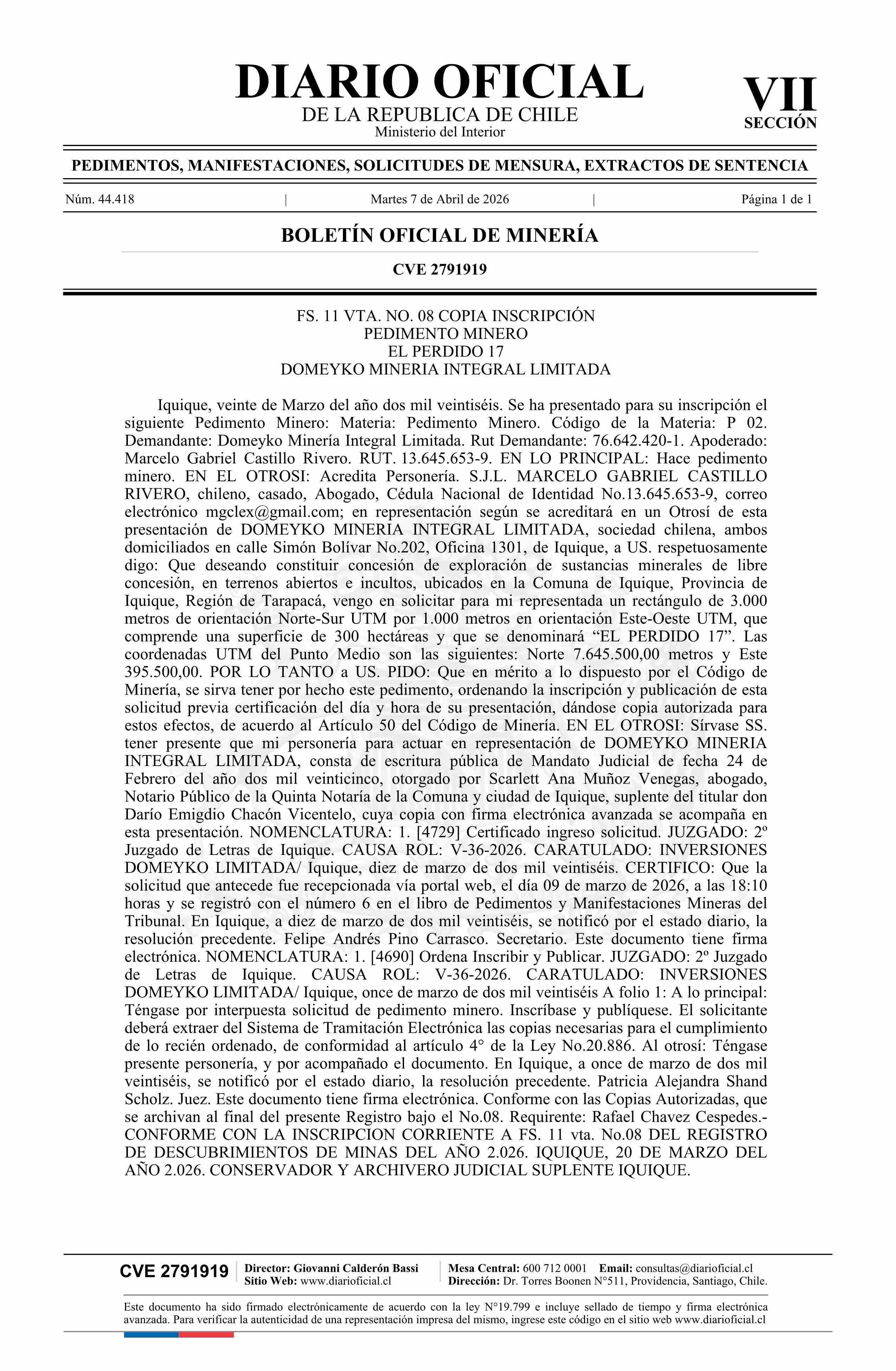 EL PERDIDO 17 / Domeyko Minería Integral Limitada 07-04-2026 DIARIO OFICIAL CHILE - BOLETÍN OFICIAL DE MINERÍA |