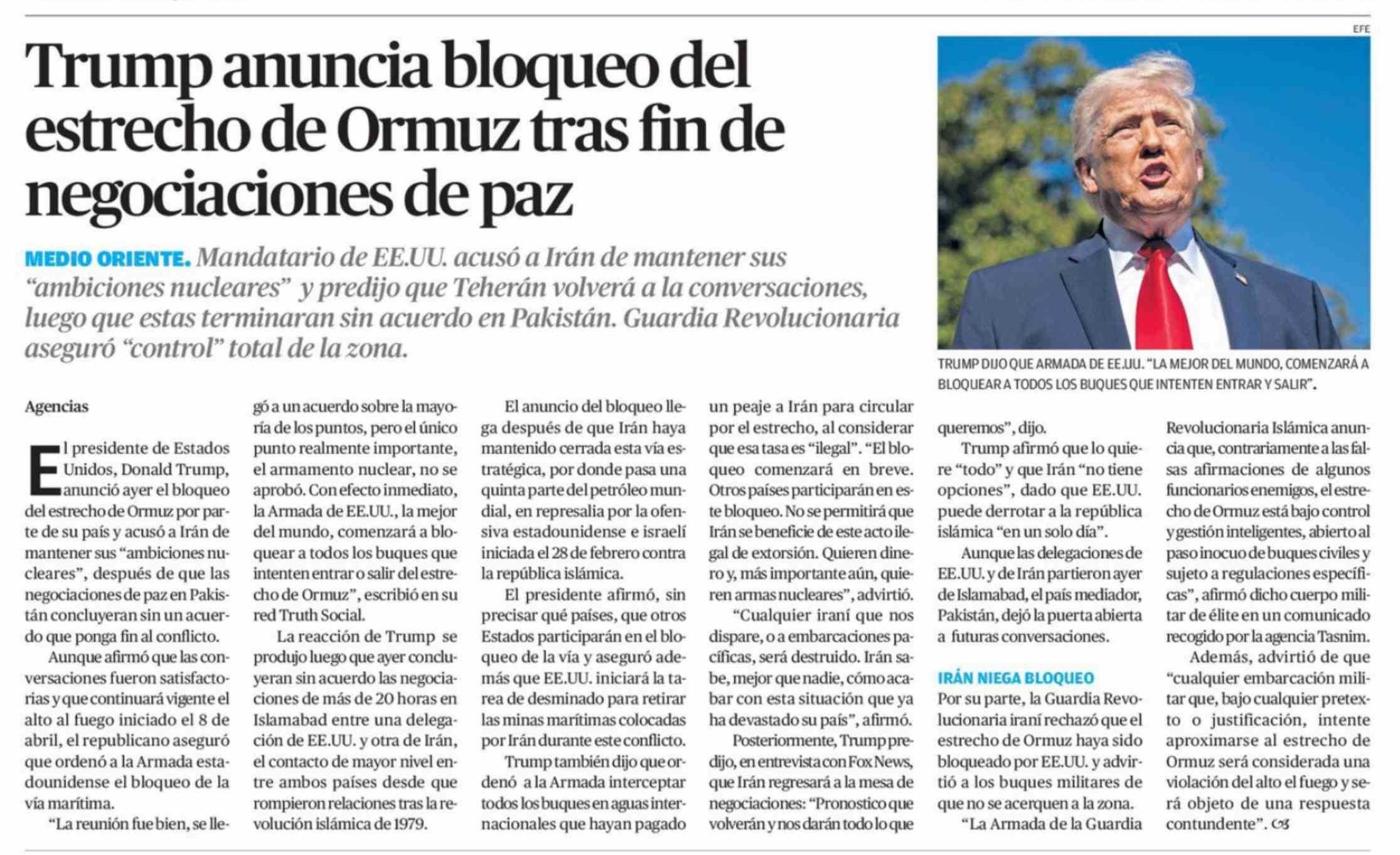 Trump anuncia bloqueo del estrecho de Ormuz tras fin de negociaciones de paz 13-04-2026 El Mercurio de Antofagasta |