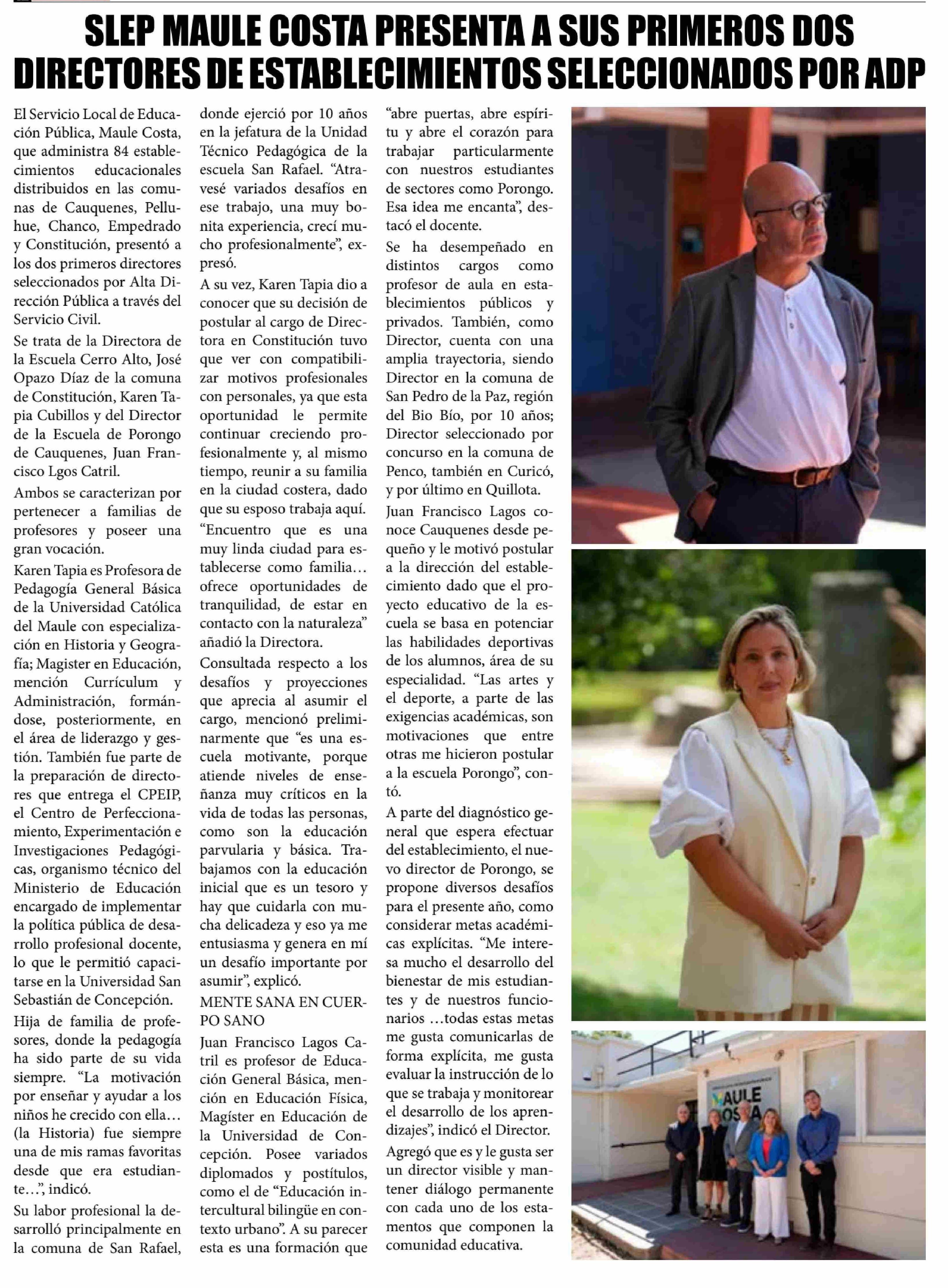 SLEP MAULE COSTA PRESENTA A SUS PRIMEROS DOS DIRECTORES DE ESTABLECIMIENTOS SELECCIONADOS POR ADP