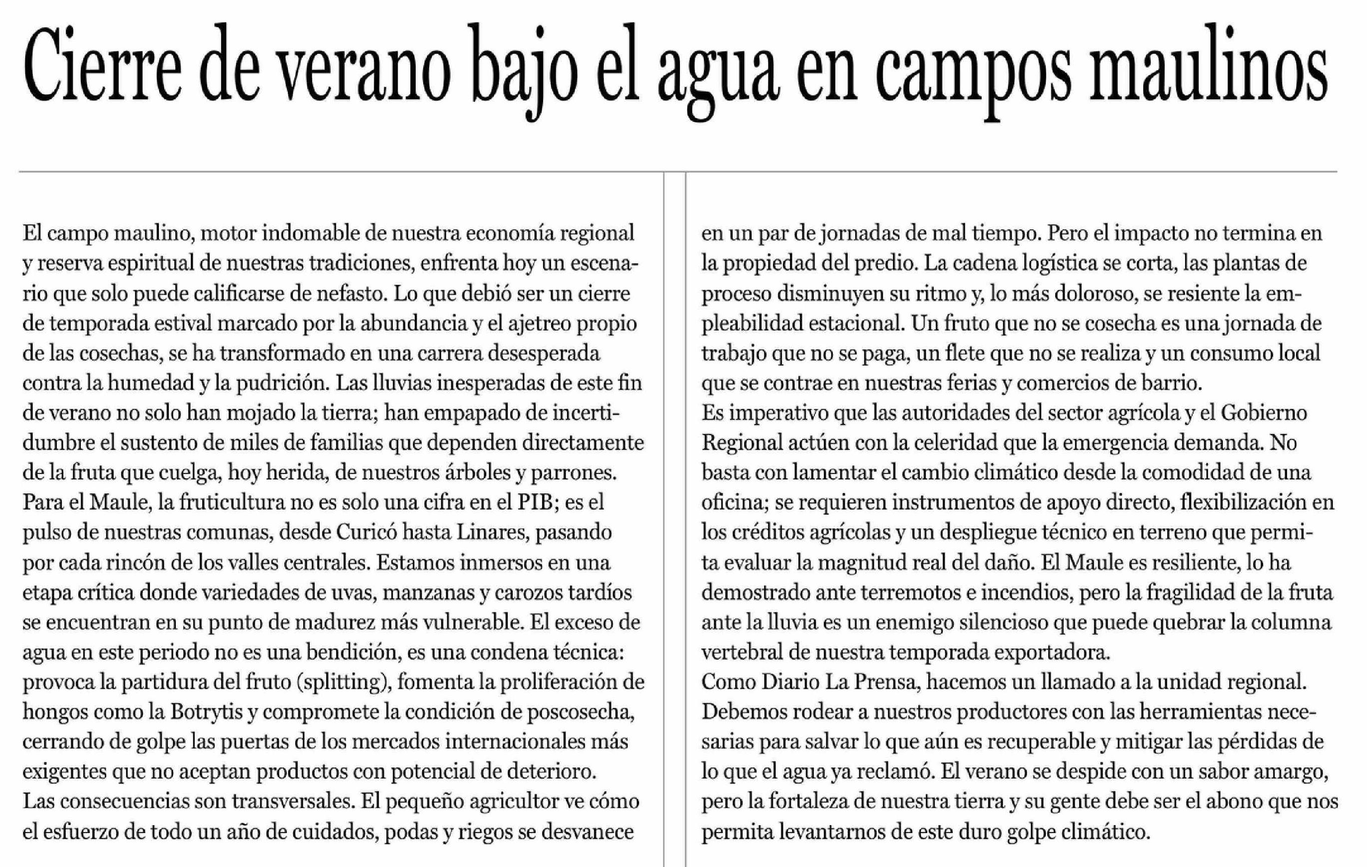 | Título: | Editorial: Cierre de verano bajo el agua en campos maulinos |