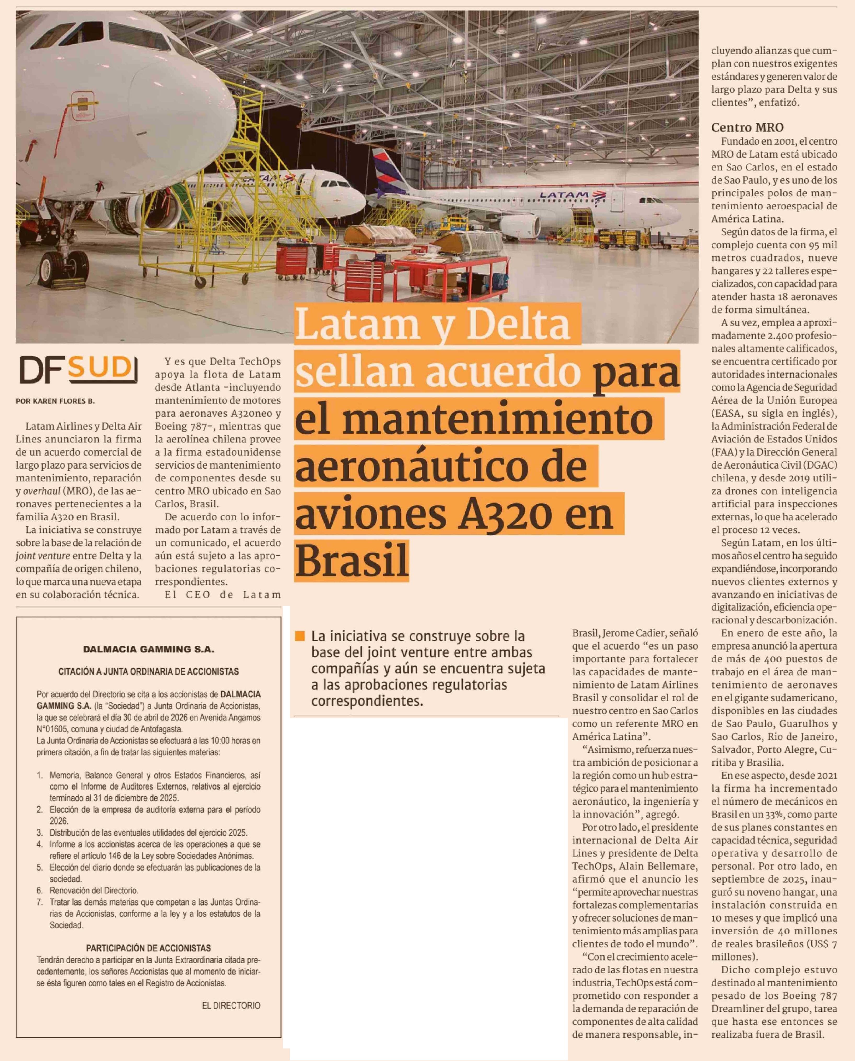 Título: Latam y Delta sellan acuerdo para el mantenimiento aeronáutico de aviones A320 en Brasil