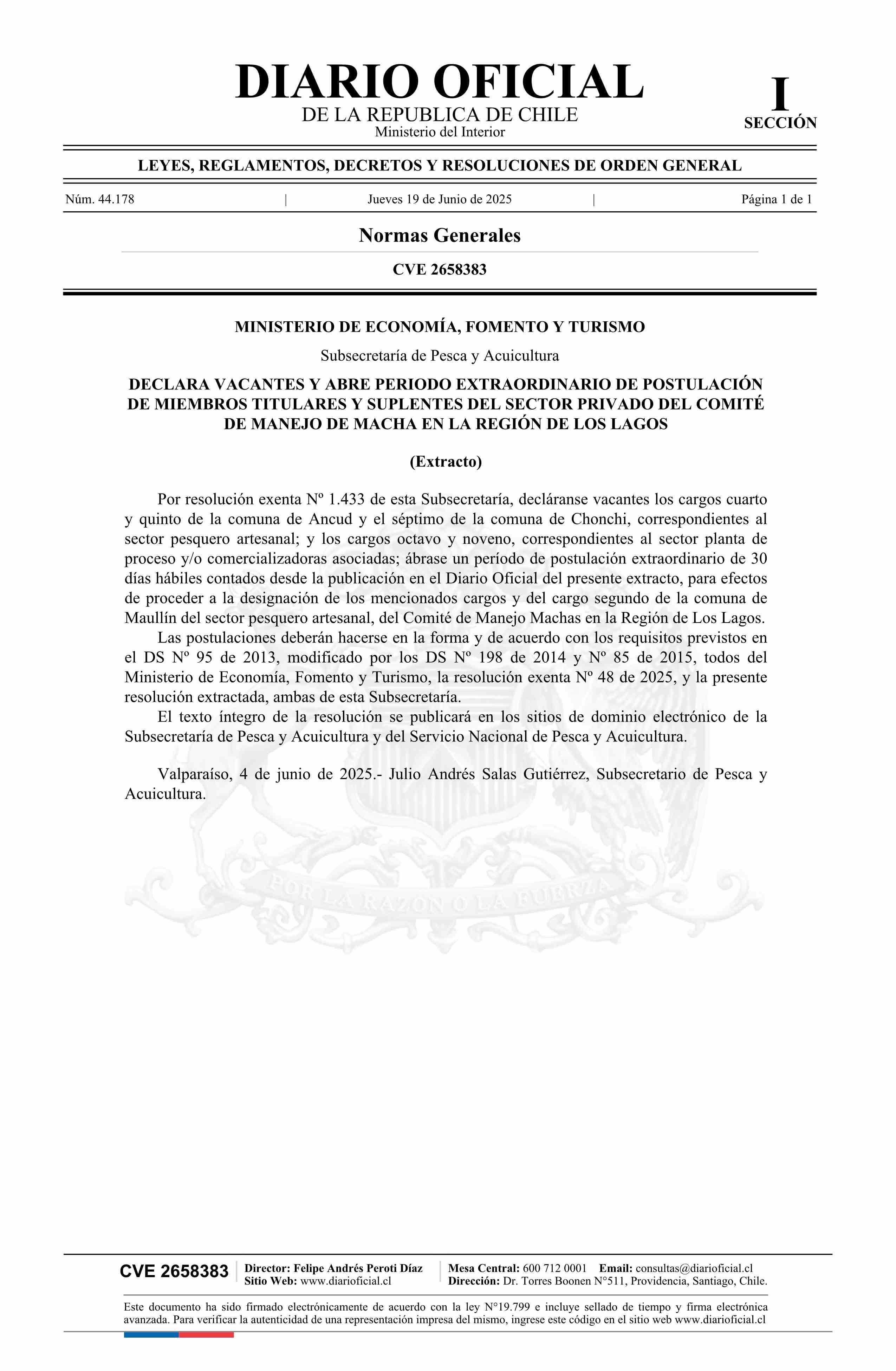 | Título: | Extracto de resolución exenta número 1.433, de 2025.- Declara vacantes y abre periodo extraordinario de postulación de miembros titulares y suplentes del sector privado del Comité de Manejo de Macha en la Región de Los Lagos |