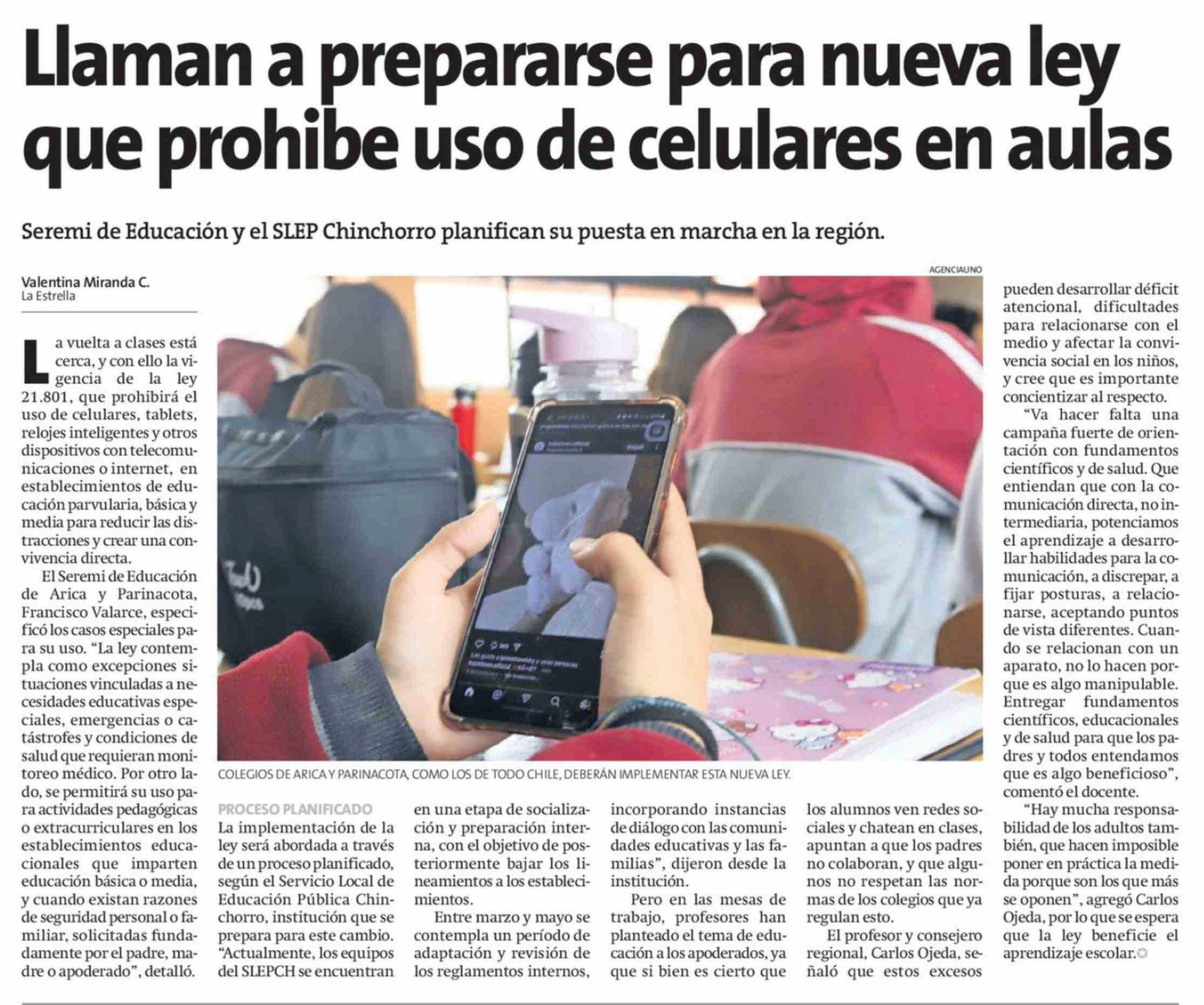 Llaman a prepararse para nueva ley que prohibe uso de celulares en aulas 23-02-2026 La Estrella de Arica |