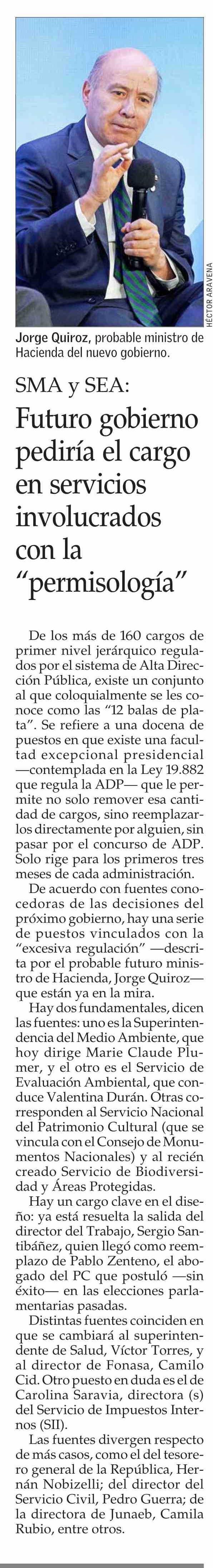 Futuro gobierno pediría el cargo en servicios involucrados con la “permisología” 15-01-2026 El Mercurio |