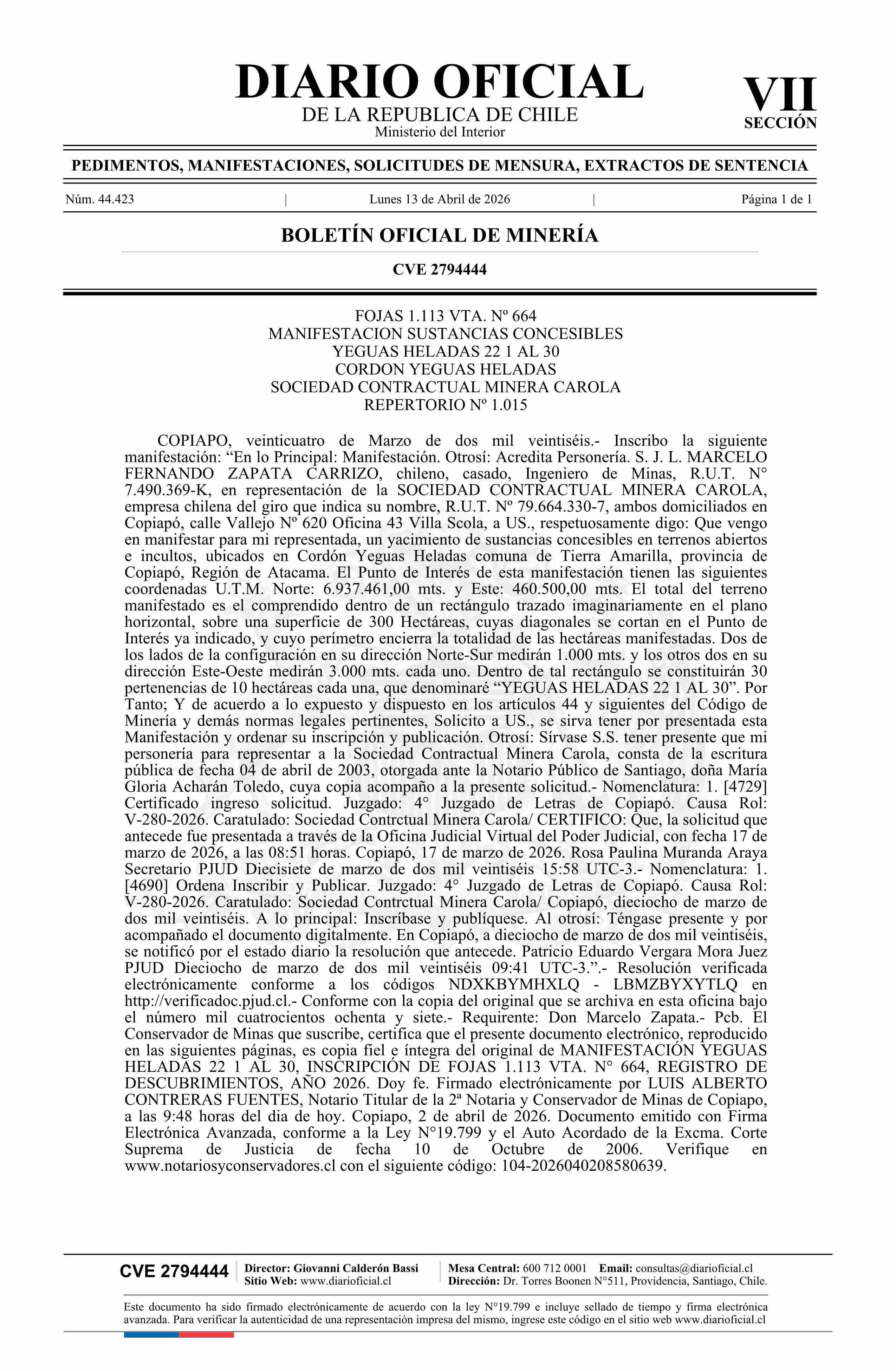 YEGUAS HELADAS 22 1 AL 30 / SCM Carola 13-04-2026 DIARIO OFICIAL CHILE - BOLETÍN OFICIAL DE MINERÍA |