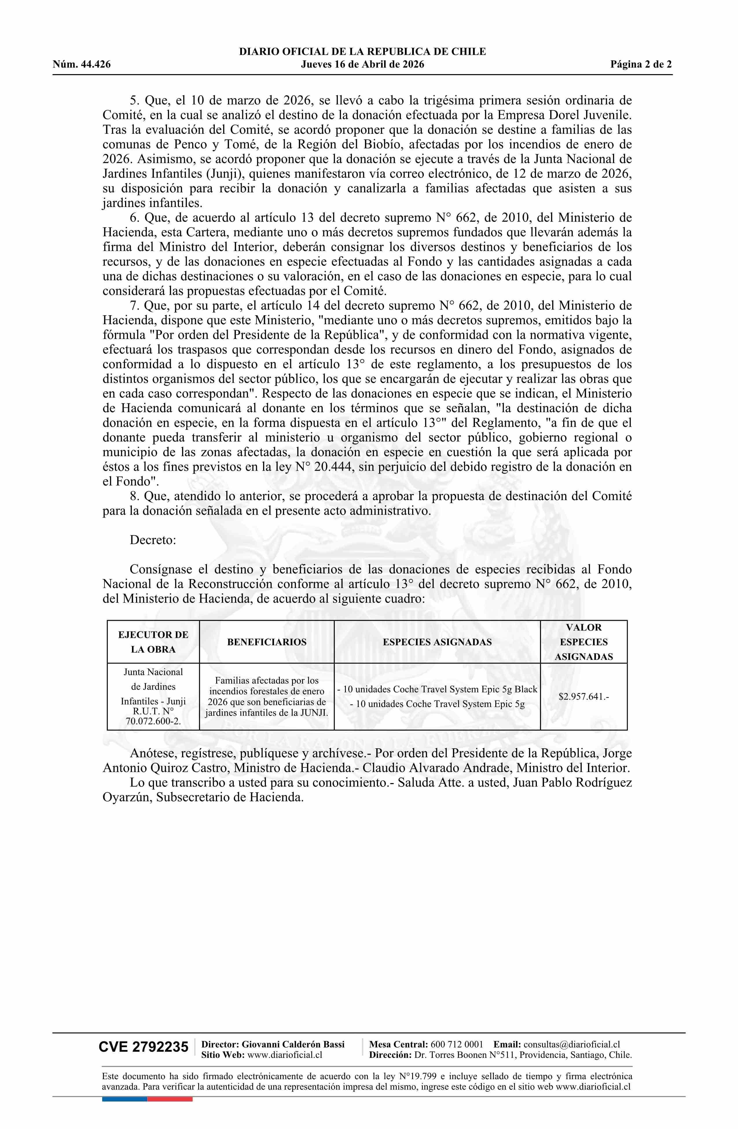 | Título: | Decreto exento número 105, de 2026.- Consigna el destino y beneficiarios de las donaciones de especies recibidas al Fondo Nacional de la Reconstrucción conforme a los artículos 13 y 14 del decreto N° 662, de 2010 |