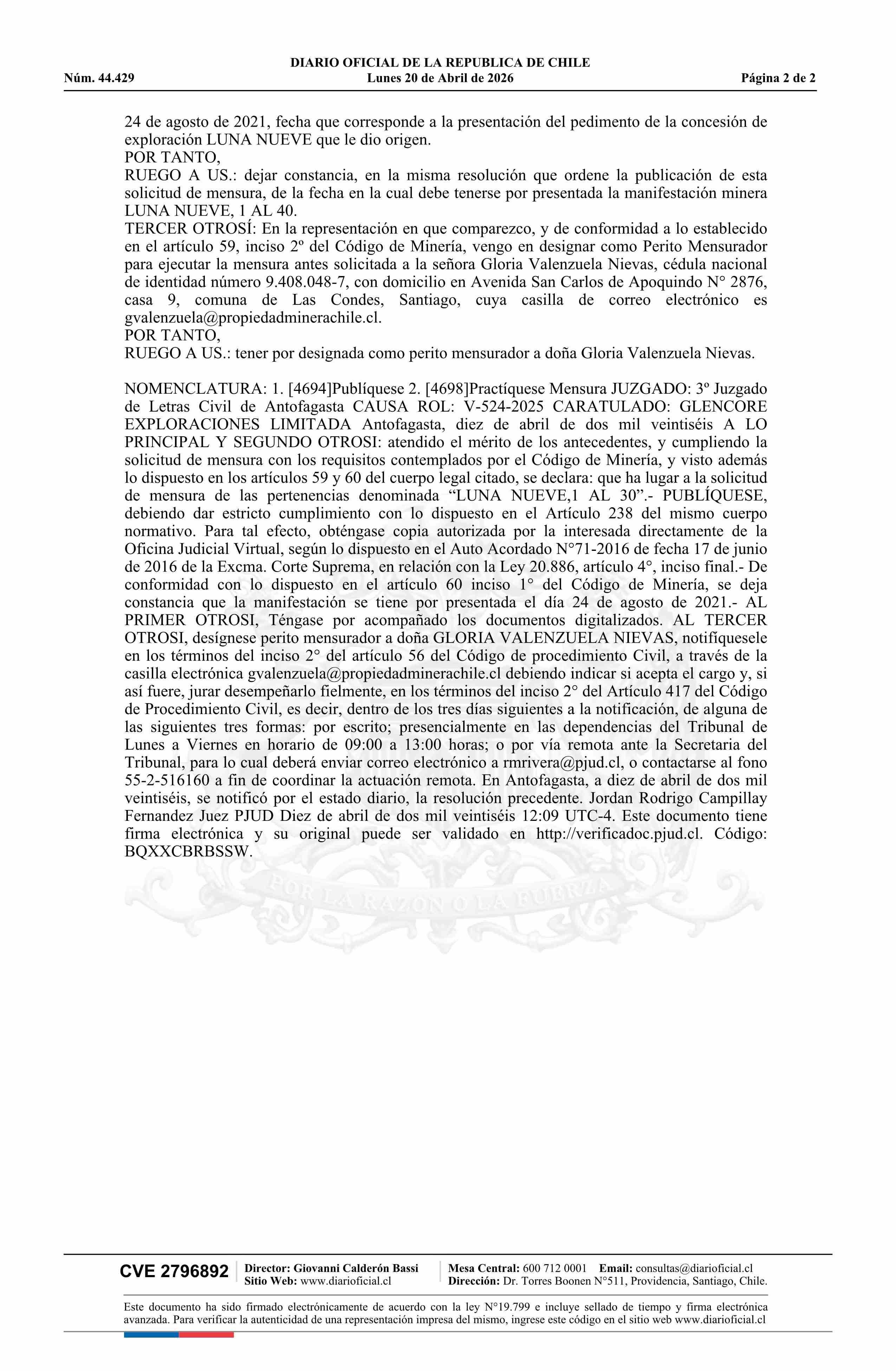 LUNA NUEVE, 1 AL 30 / Glencore Exploraciones Limitada 20-04-2026 DIARIO OFICIAL CHILE - BOLETÍN OFICIAL DE MINERÍA |